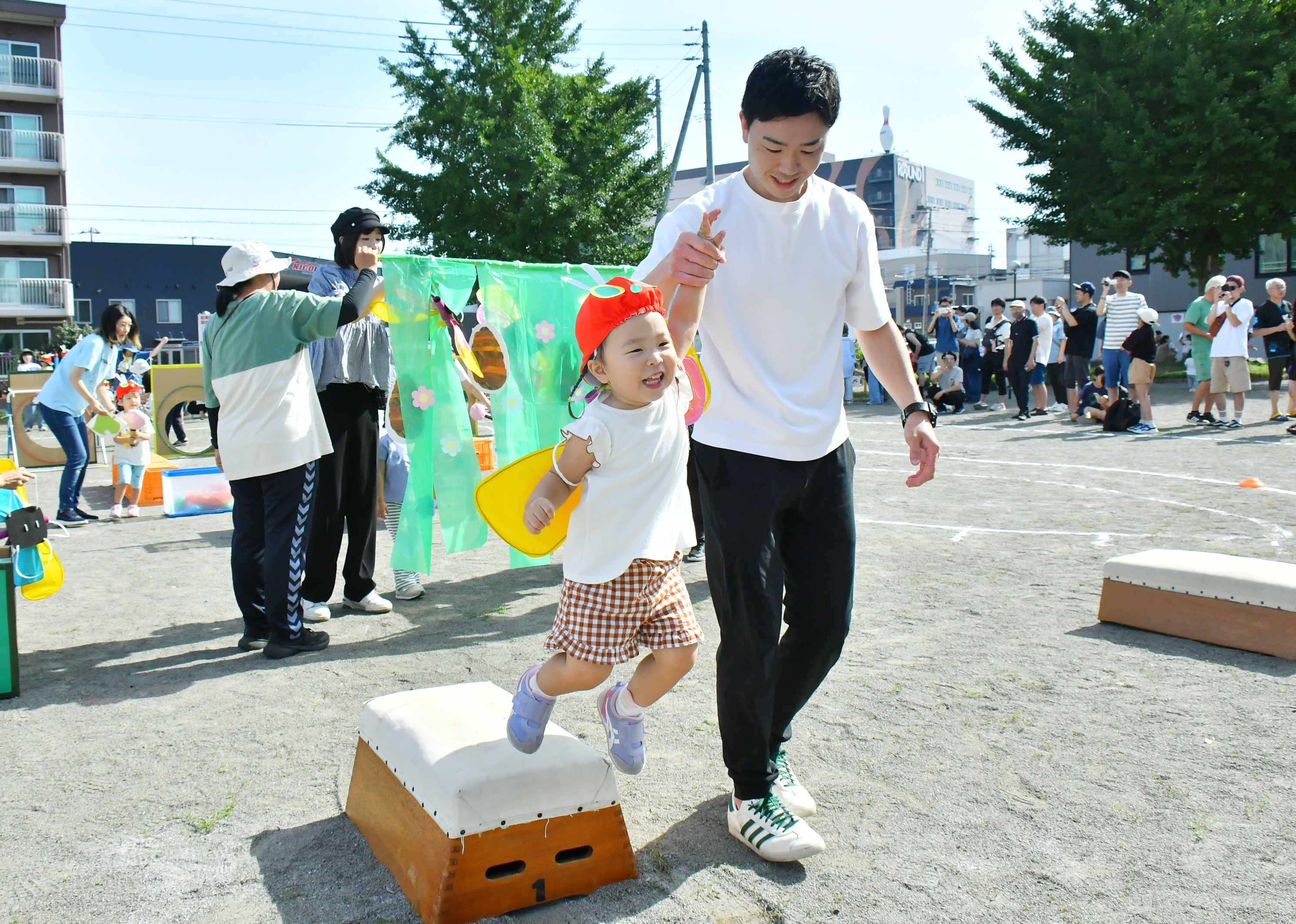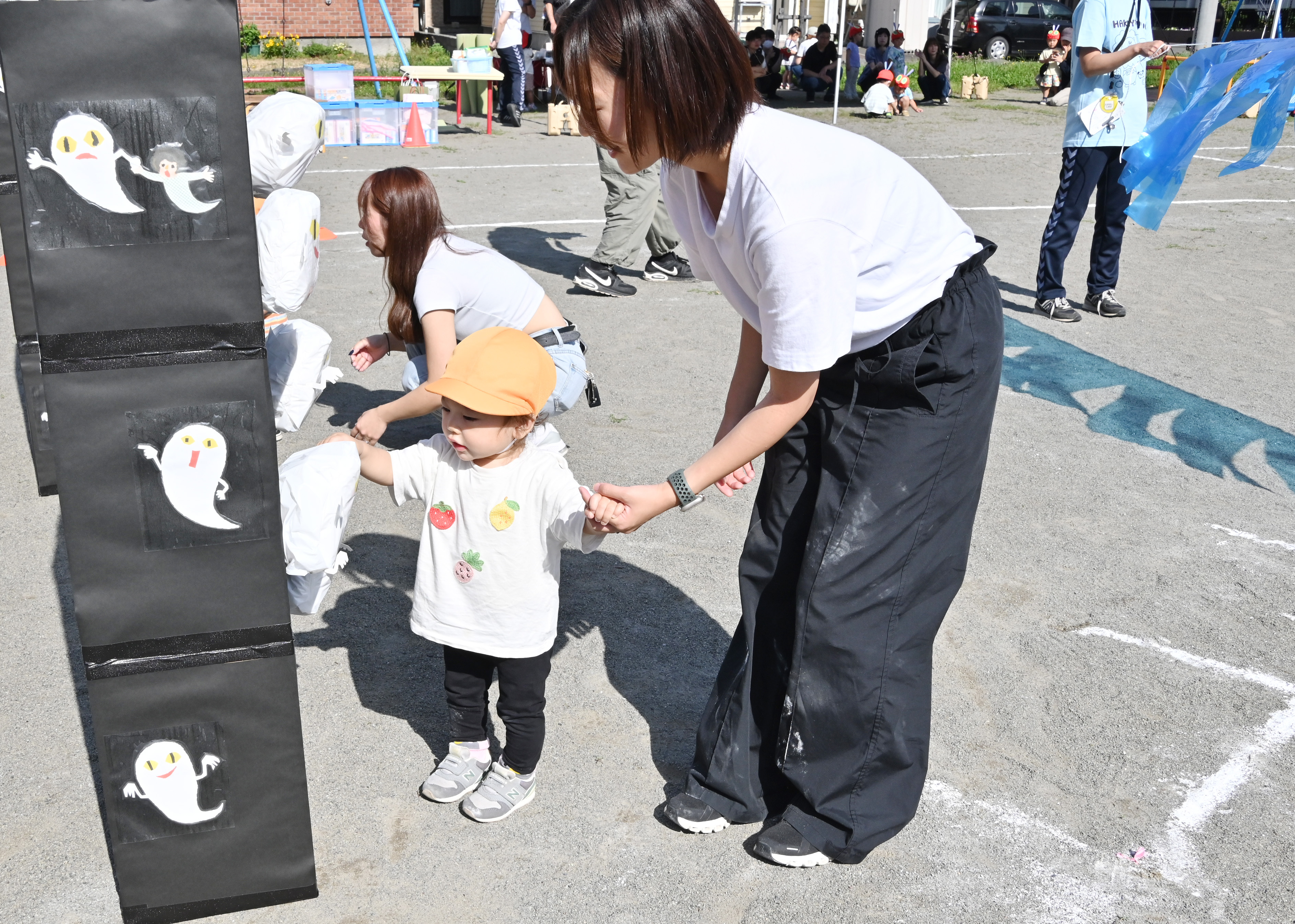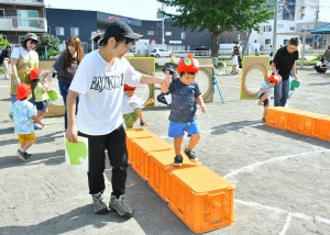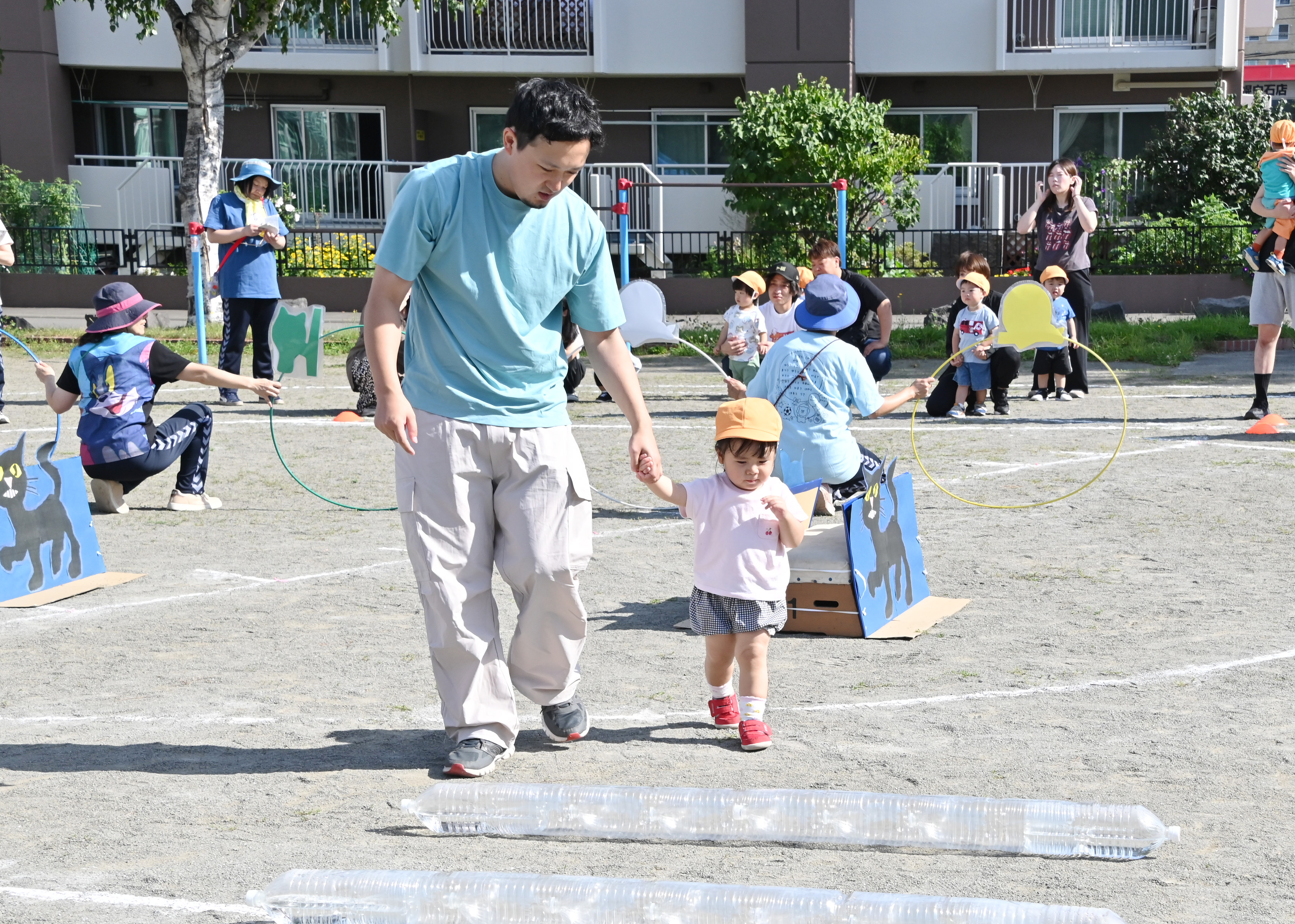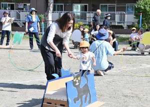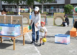 果物パネルくぐりやカートン渡りを、お父さん・お母さんと一緒に楽しみました。