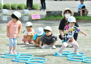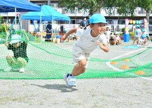 障害走は片足ケンパでホースの輪を進んだり、網くぐり・平均台渡り