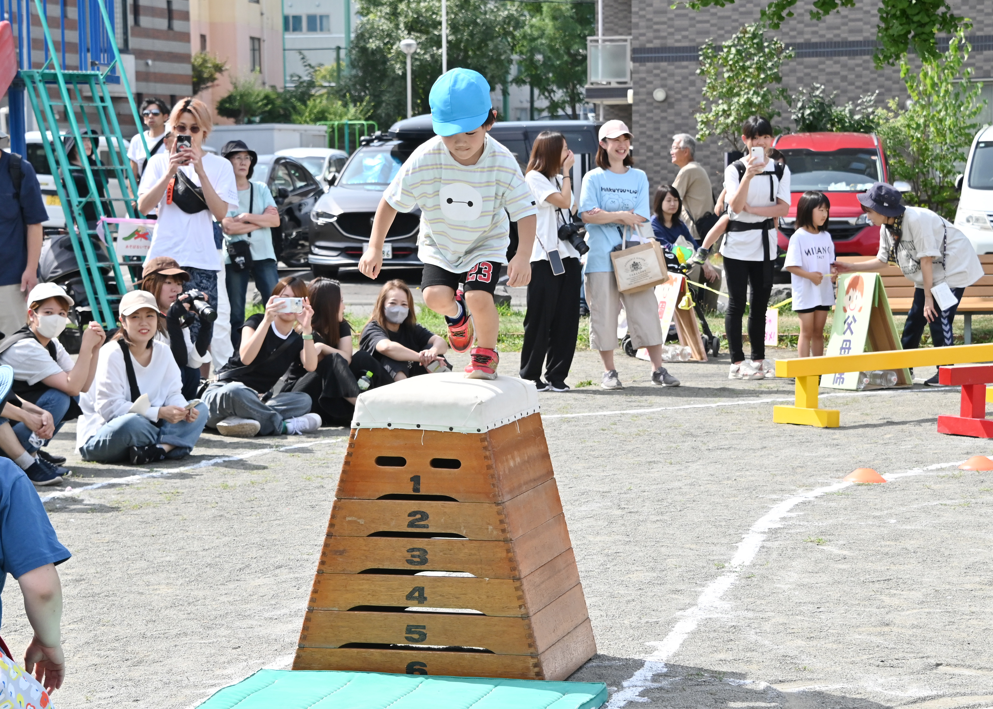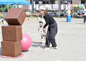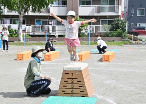 障害走はホースの輪を両足ジャンプで進んだり、カートン渡り・5段の跳び箱ジャンプに挑戦しました。