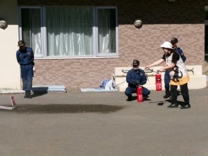 その後は園庭に戻り、保育士の消火訓練を見ました。