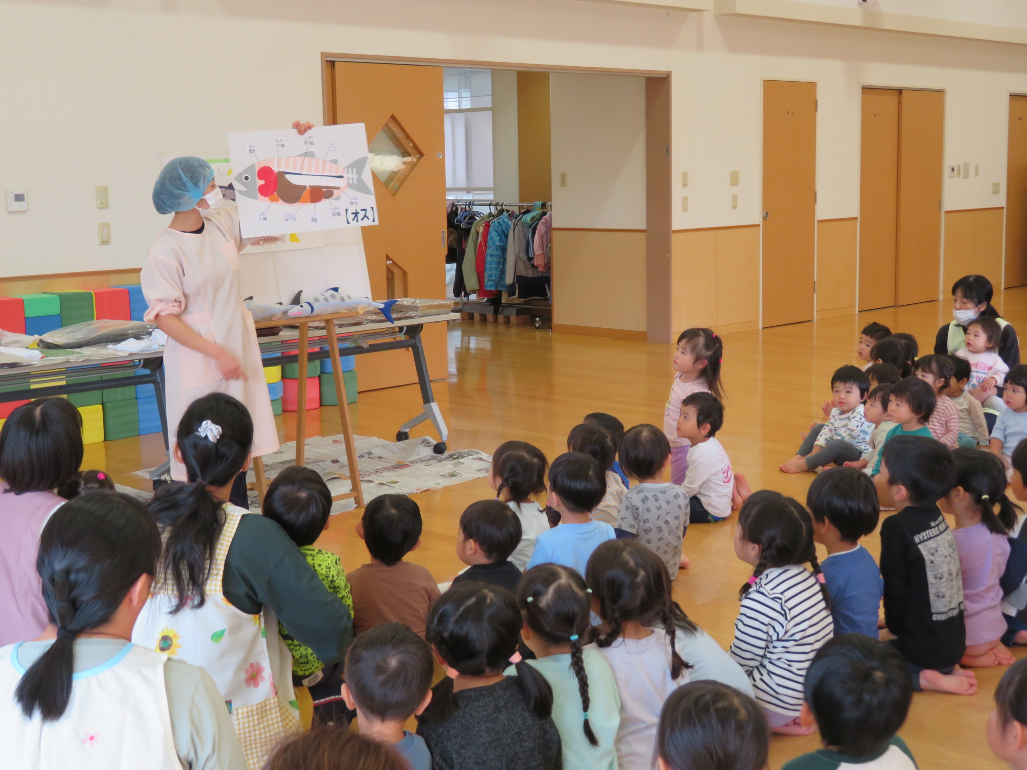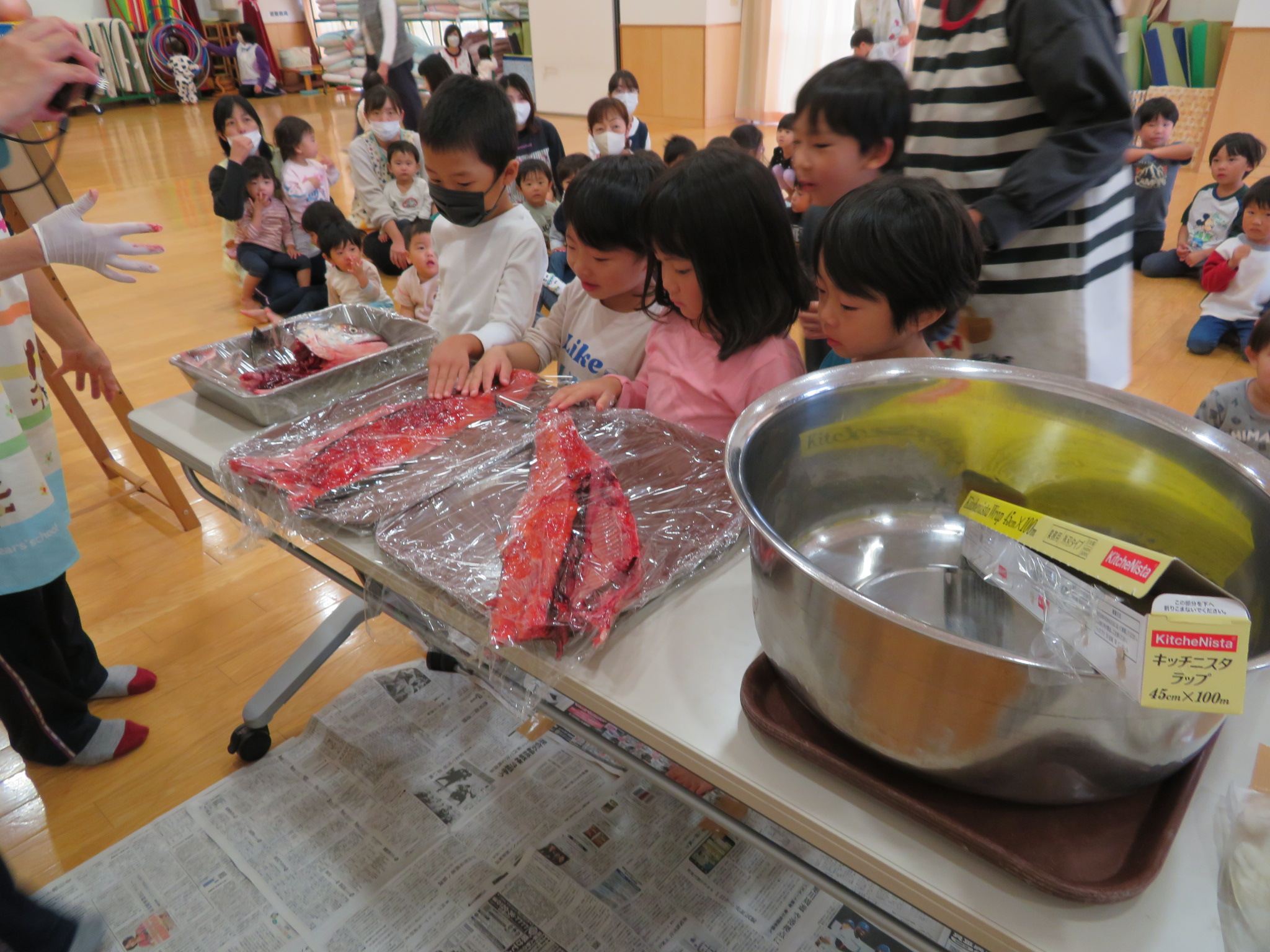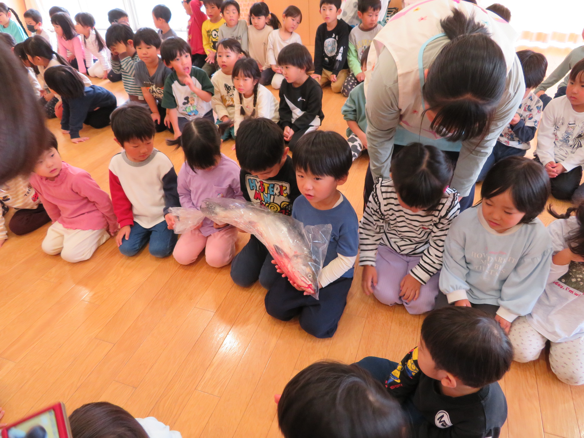 聞き、その後、小さいクラスの子から鮭に触れてみま
