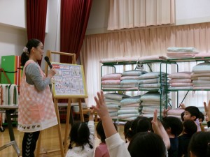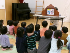 危険を予測する『子ども忍者 もしかして丸』の紙芝居を真剣に見ていた子どもたち。