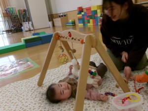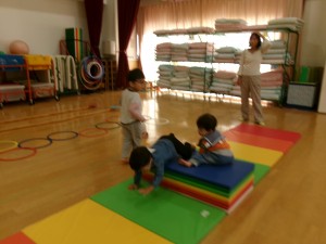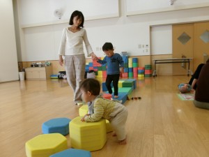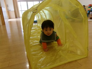 カラーマットを登ったり、大型積み木の橋渡り、トンネルくぐりで、
