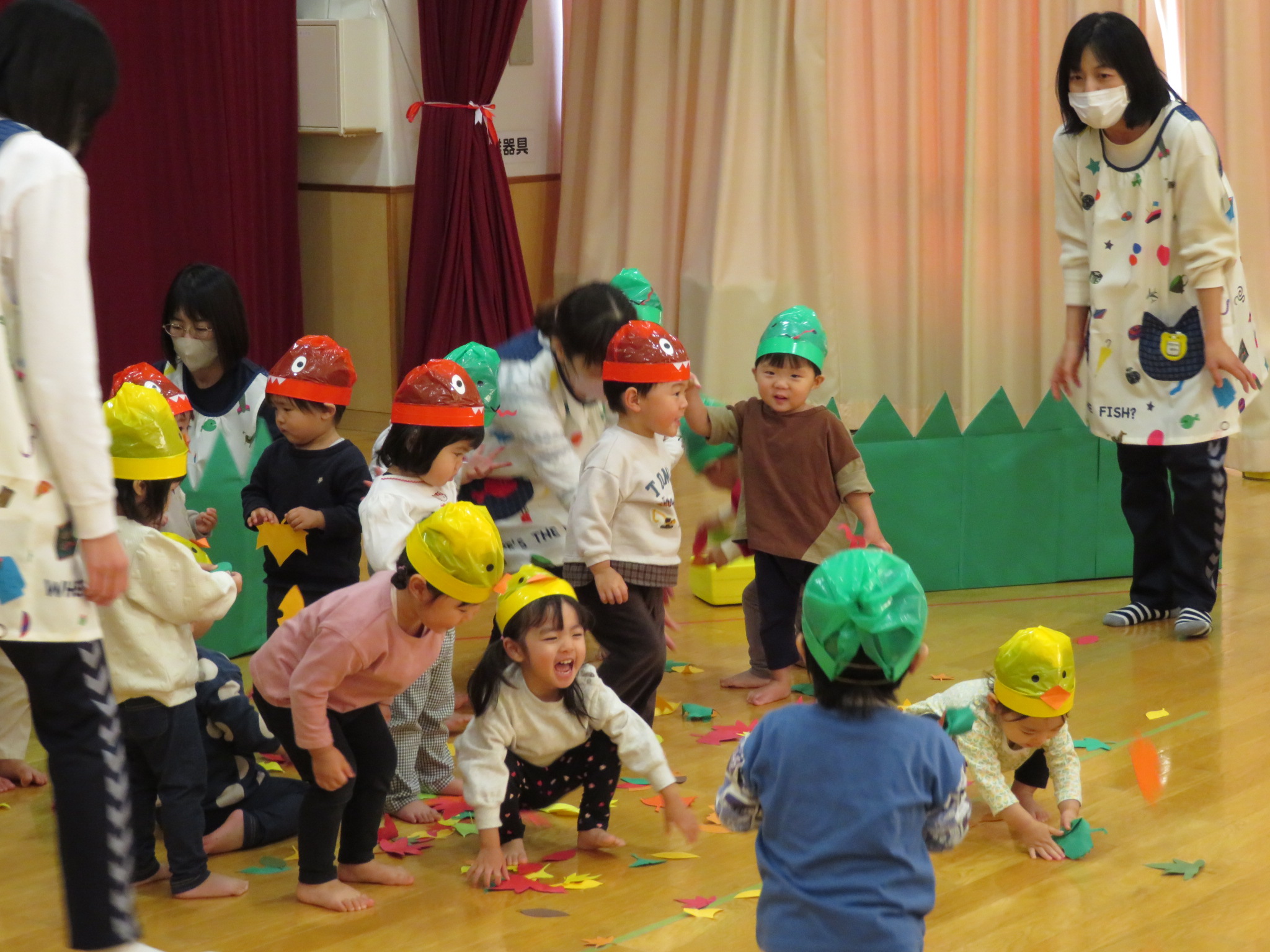 みんなで落ち葉を降らせたり、葉っぱオバケと追いかけっこをして楽しみました。