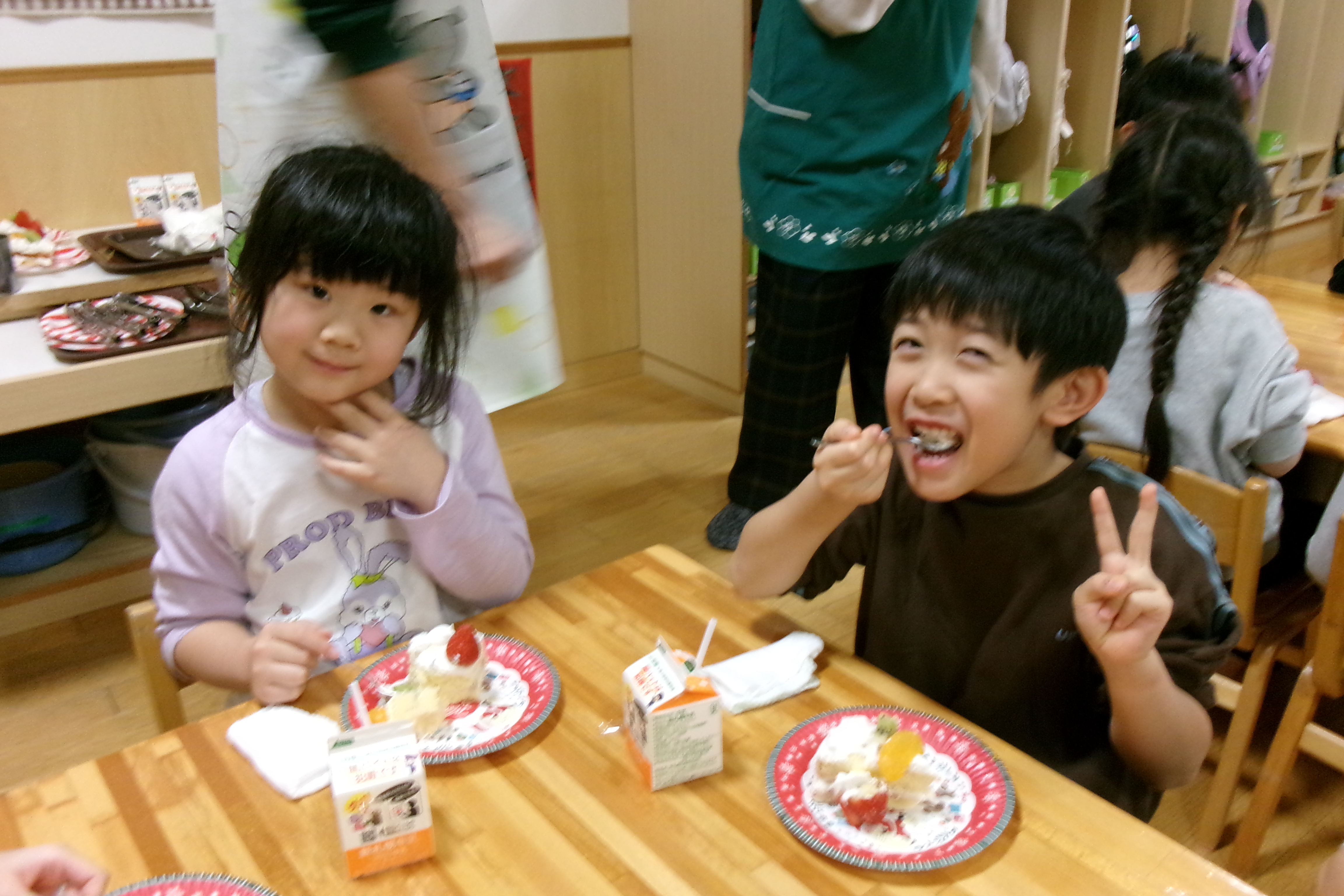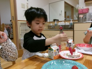 幼児クラスはクリームを絞ったり果物をのせたり、自分たちでデコレーションしました。