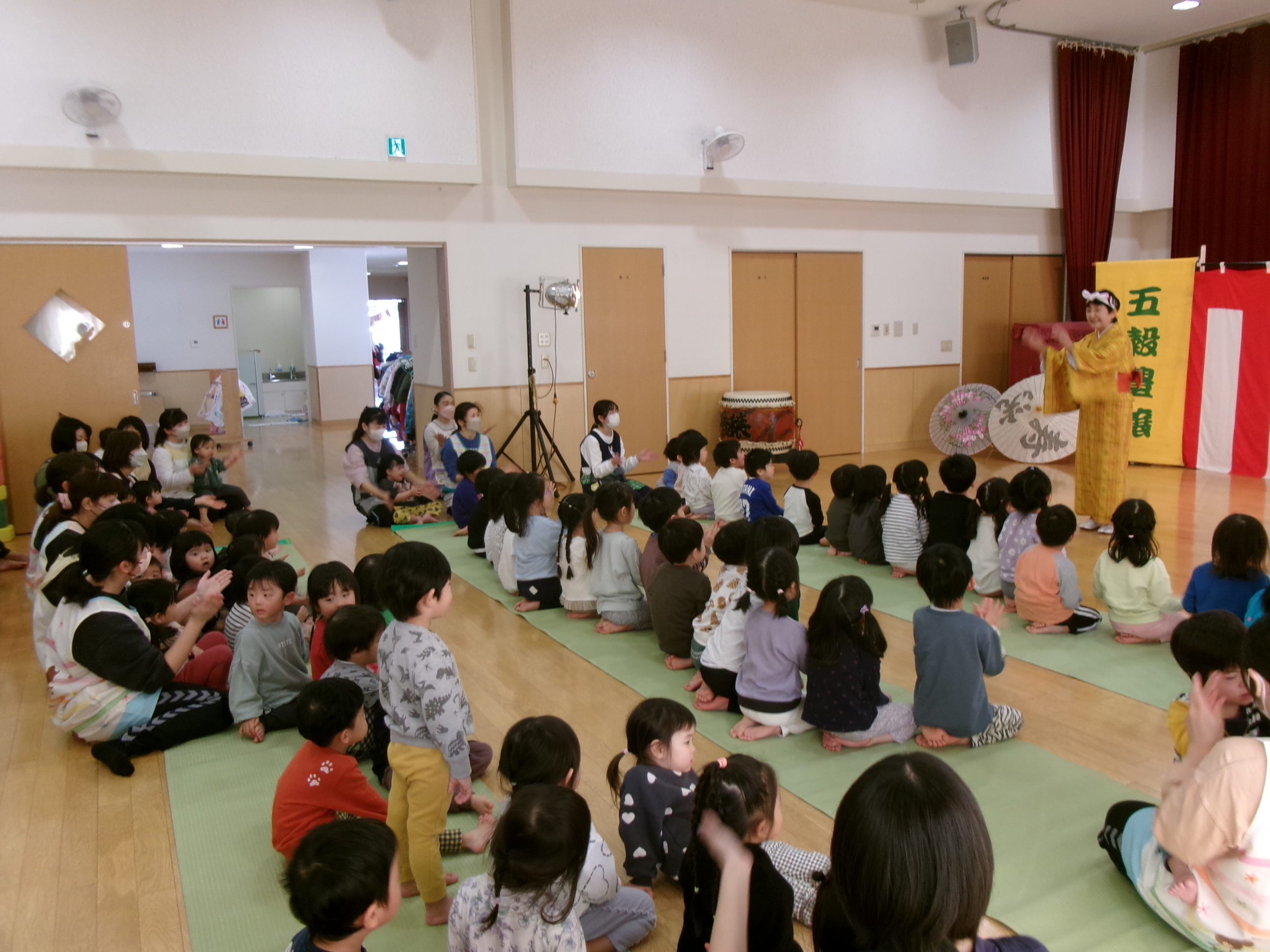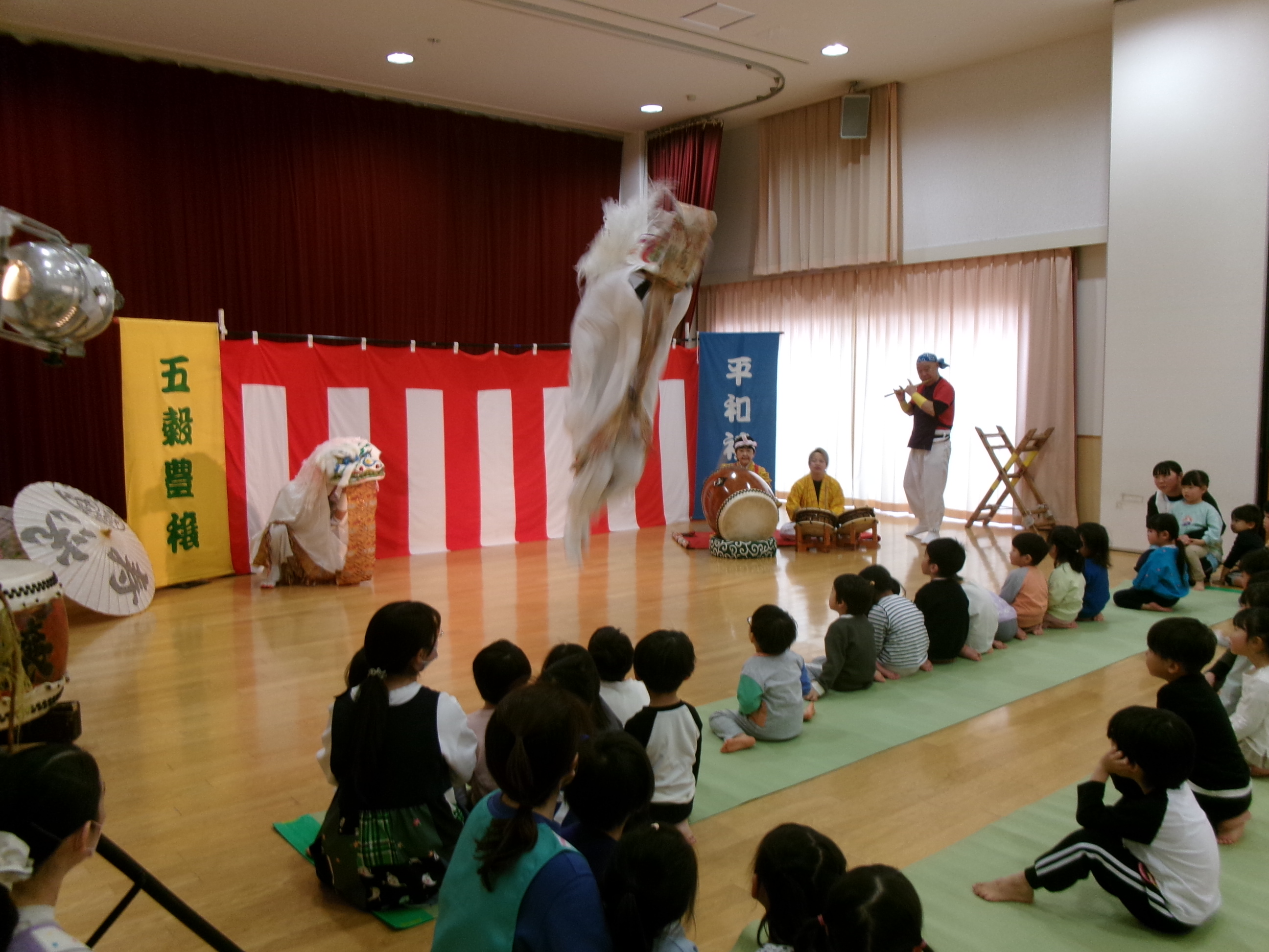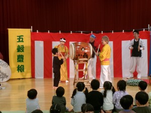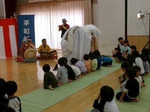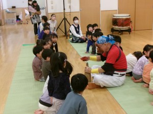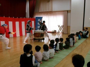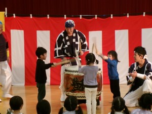 公演のあと、らいおん組は、和太鼓を叩いてみまし