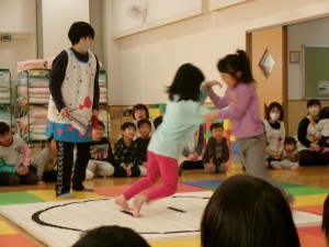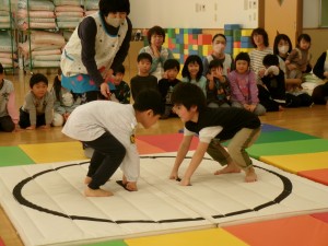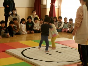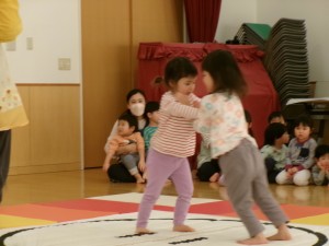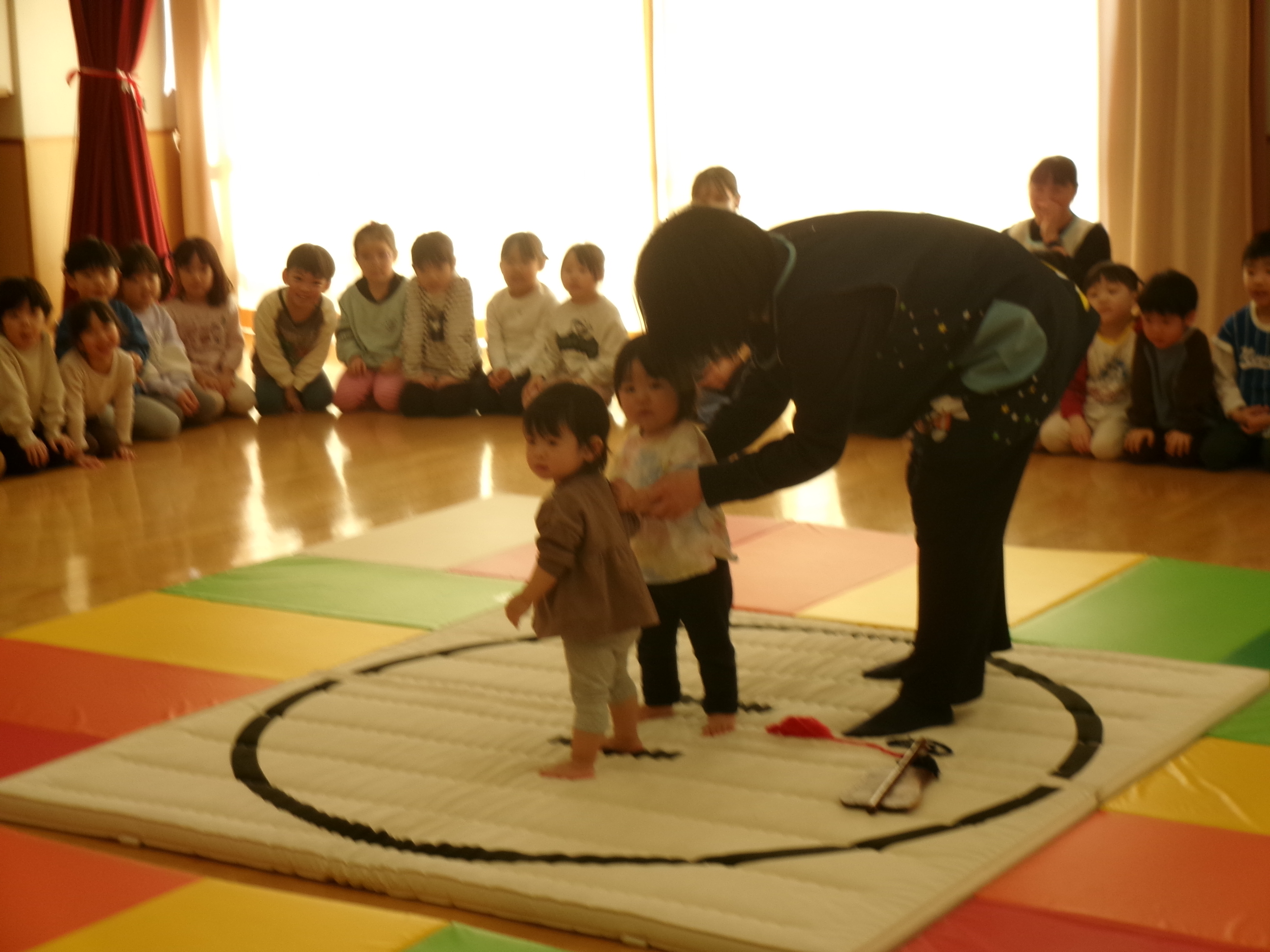 1歳児クラスのみかん組は、土俵の上にしゃがんで、