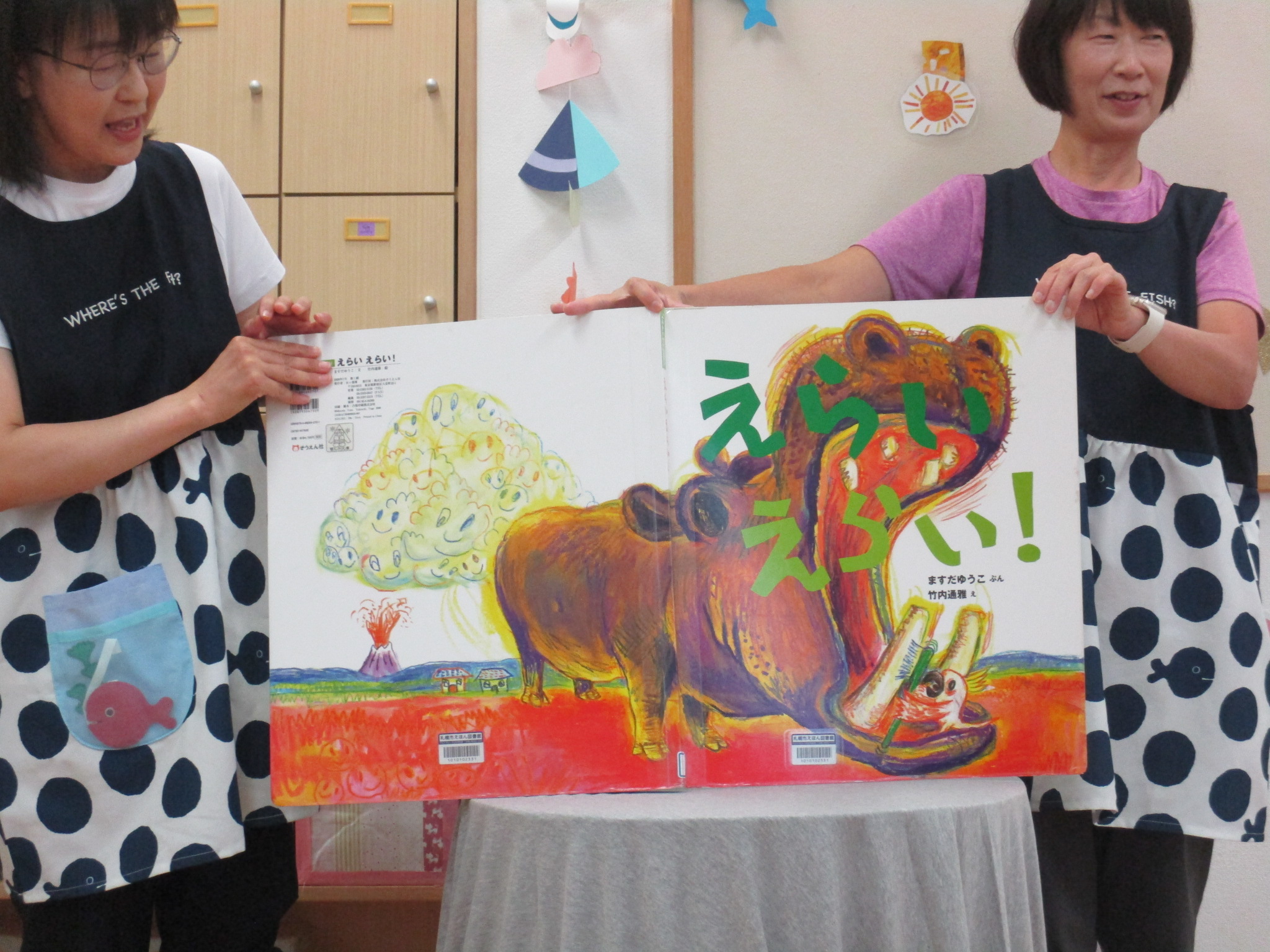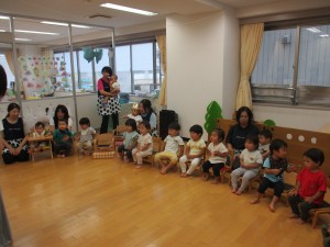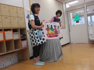 保育士の出し物は、大型絵本「おべんとうばす」と「えらいえらい」の読み聞かせでした。みんなお返事や拍手で一緒に楽しみましたよ。