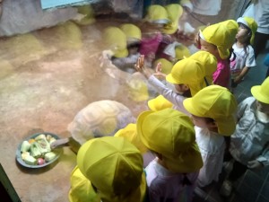 黄組さんは、爬虫類館でカメのエサを見せてもらい、エサを食べる姿をみせてもらいました。カメはたくさんのエサを1時間かけて食べるそうです。