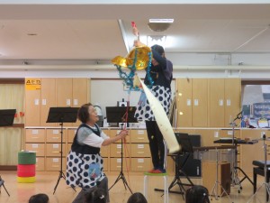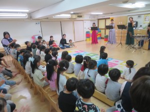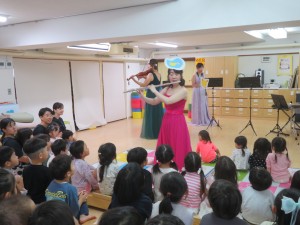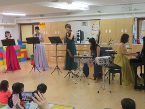 フルート、クラリネット、バイオリン、ピアノ、打楽器を紹介してくれたり、みんなが知っている、ドラえもんやアンパンマンの歌、童謡などを演奏してくれました。