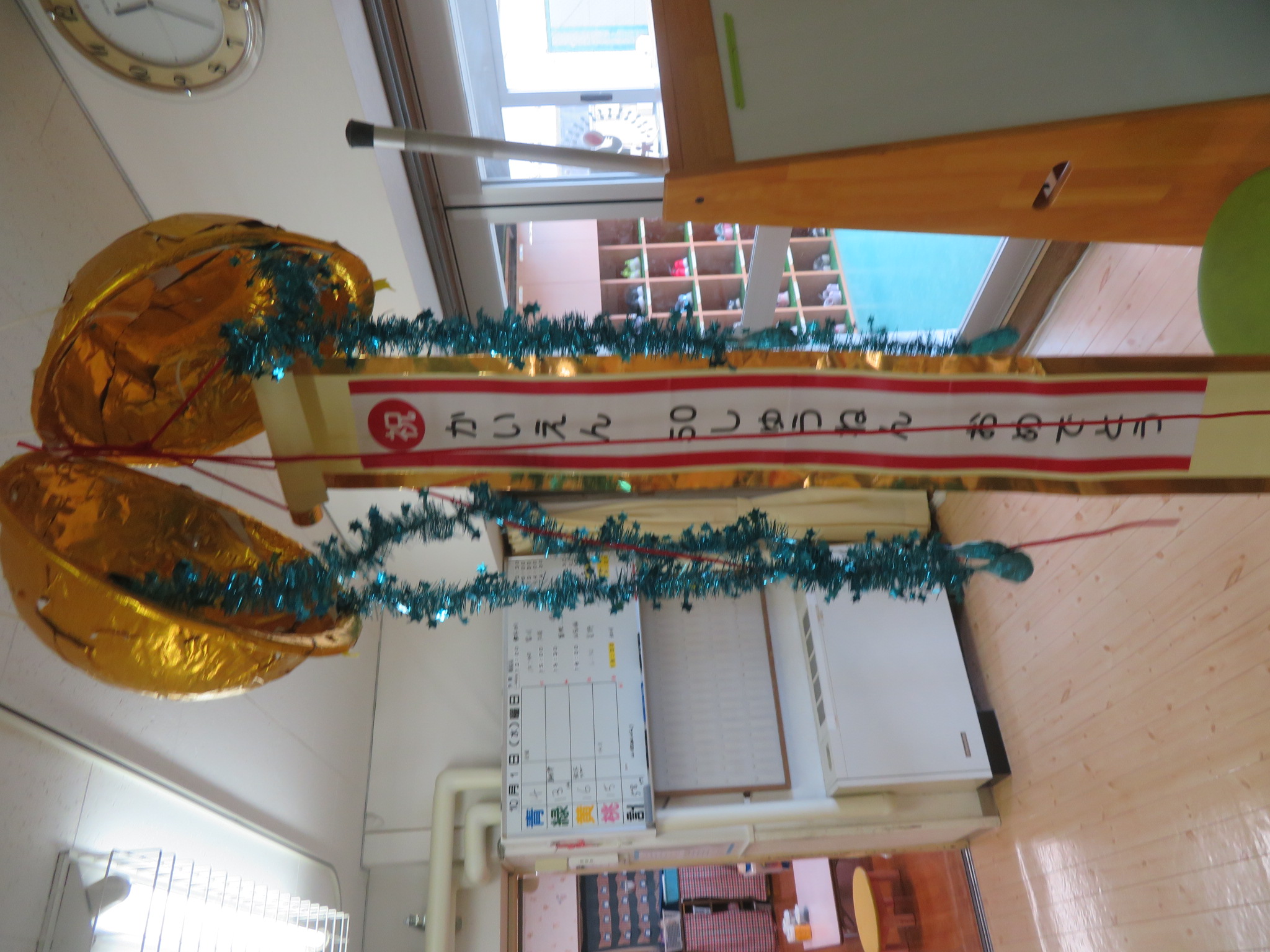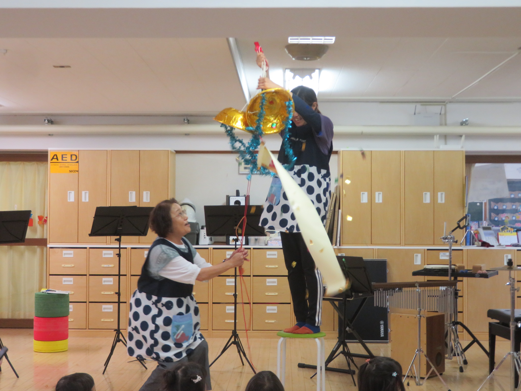 園長先生からのお話を聞き、お祝いの「くす玉」を割って「おめでとう!」とお祝いをしました。
