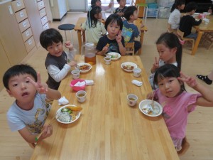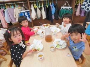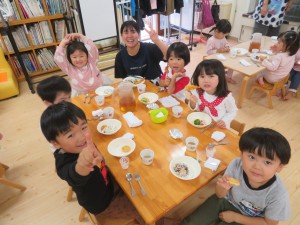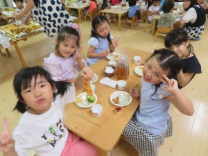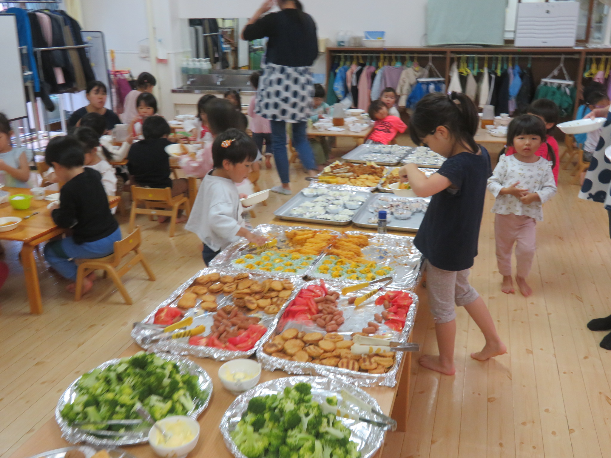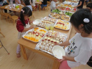 「おいしそう!」「何食べようかな?」とたくさんならんだご馳走を前に、好きな物を選んで皿に入れていました。何度もおかわりをして、お腹いっぱい満足した表情の子ども達でした。