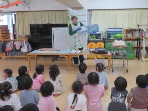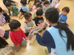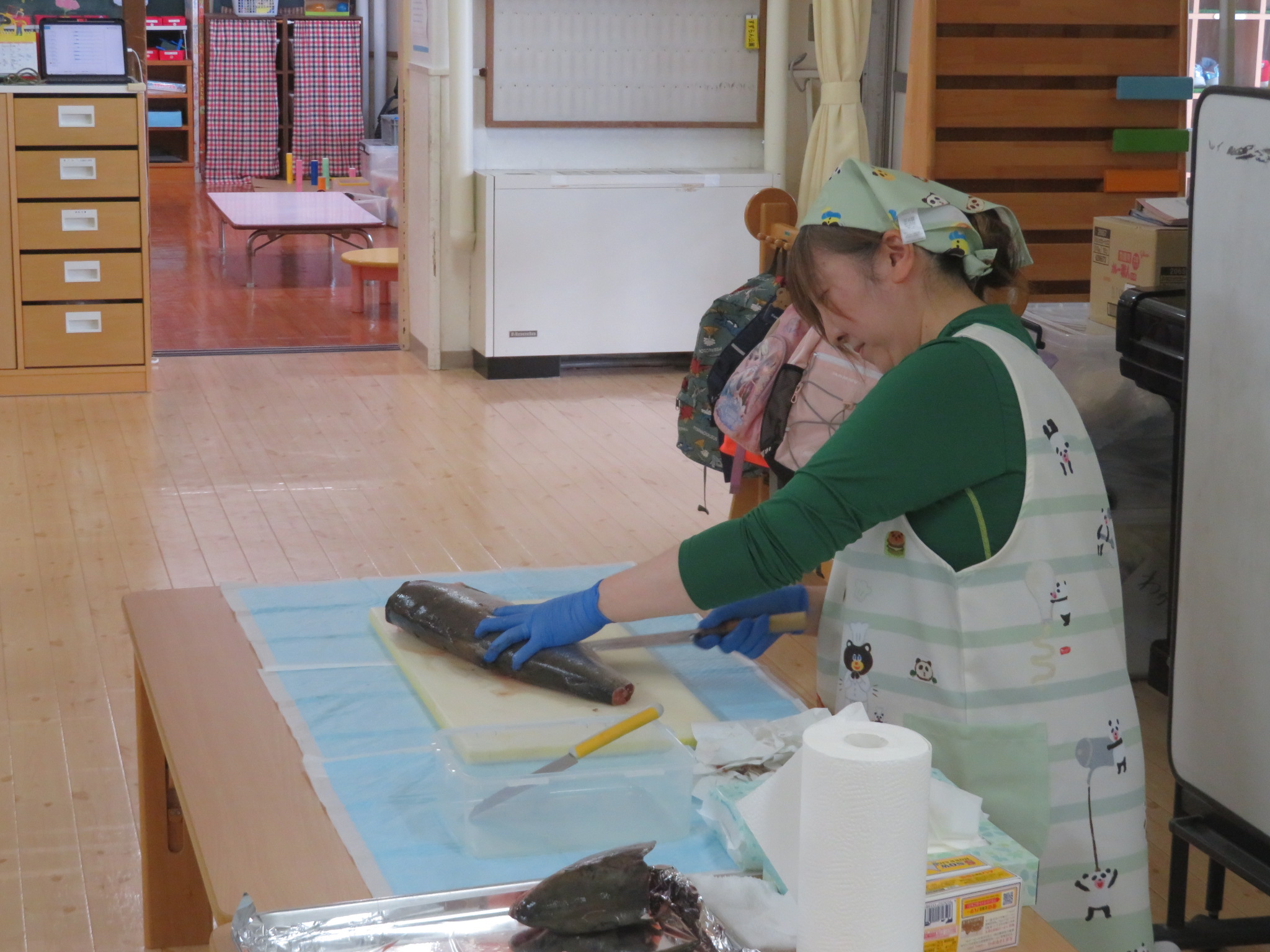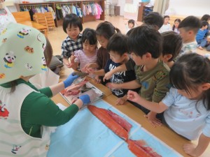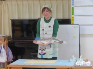 今日は栄養士に、鮭が川で生まれ、海に行き、また生まれた川に帰ってくる話を絵本を見ながら教えてもらいました。