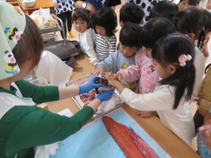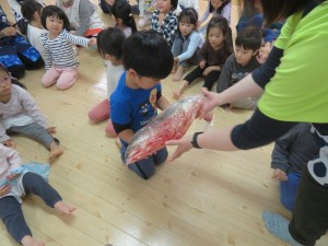 顔はちょっぴり怖かったけど恐る恐る触ってみると「つるつるしてる!」「なんか生臭い」等と感触や匂いも楽しんでいました。