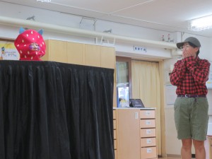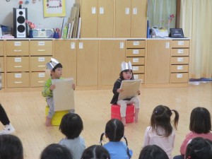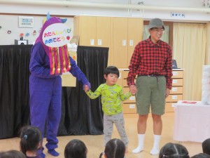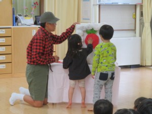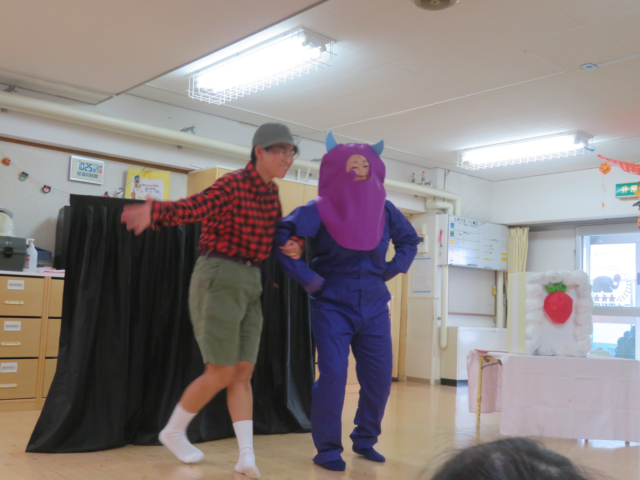 保育士からの出し物は「ぜったいにおしちゃダメ?」でした。