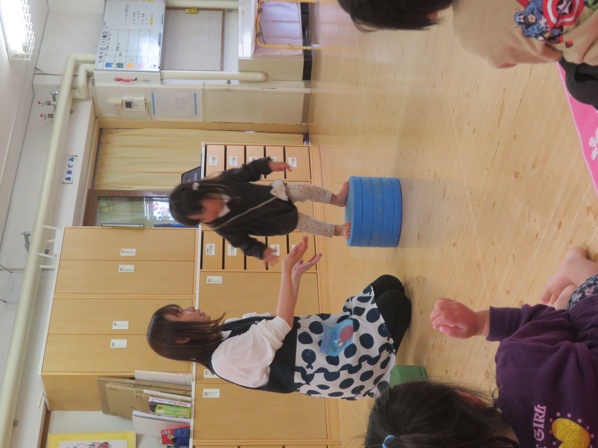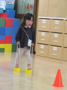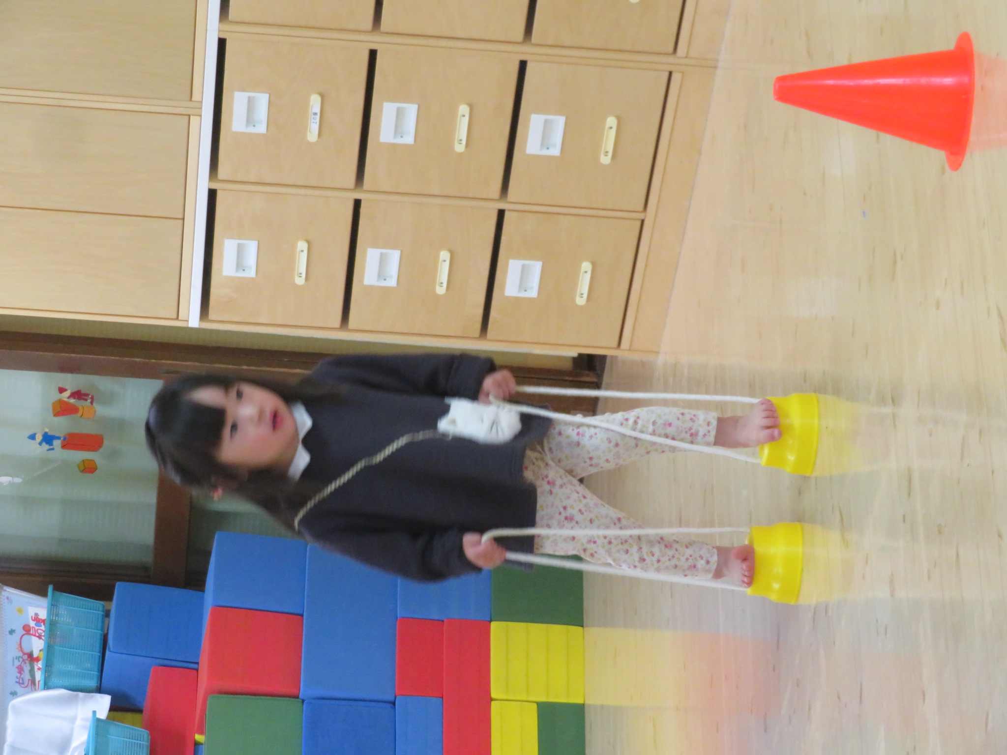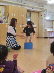 桃組のお友達のパフォーマンスは、上手にできるようになったジャンプと、缶ぽっくりを披露してくれました。