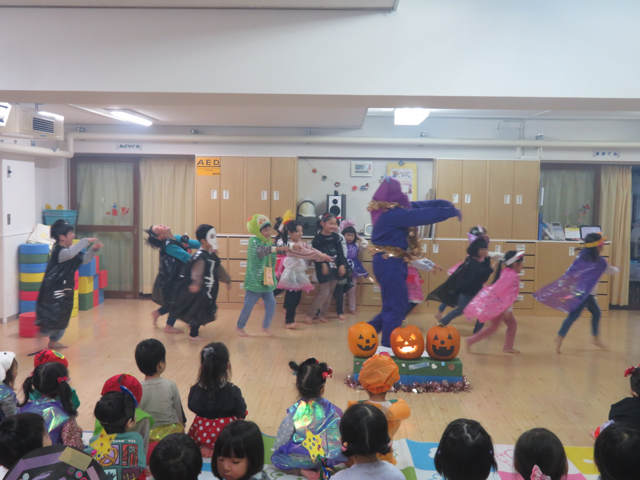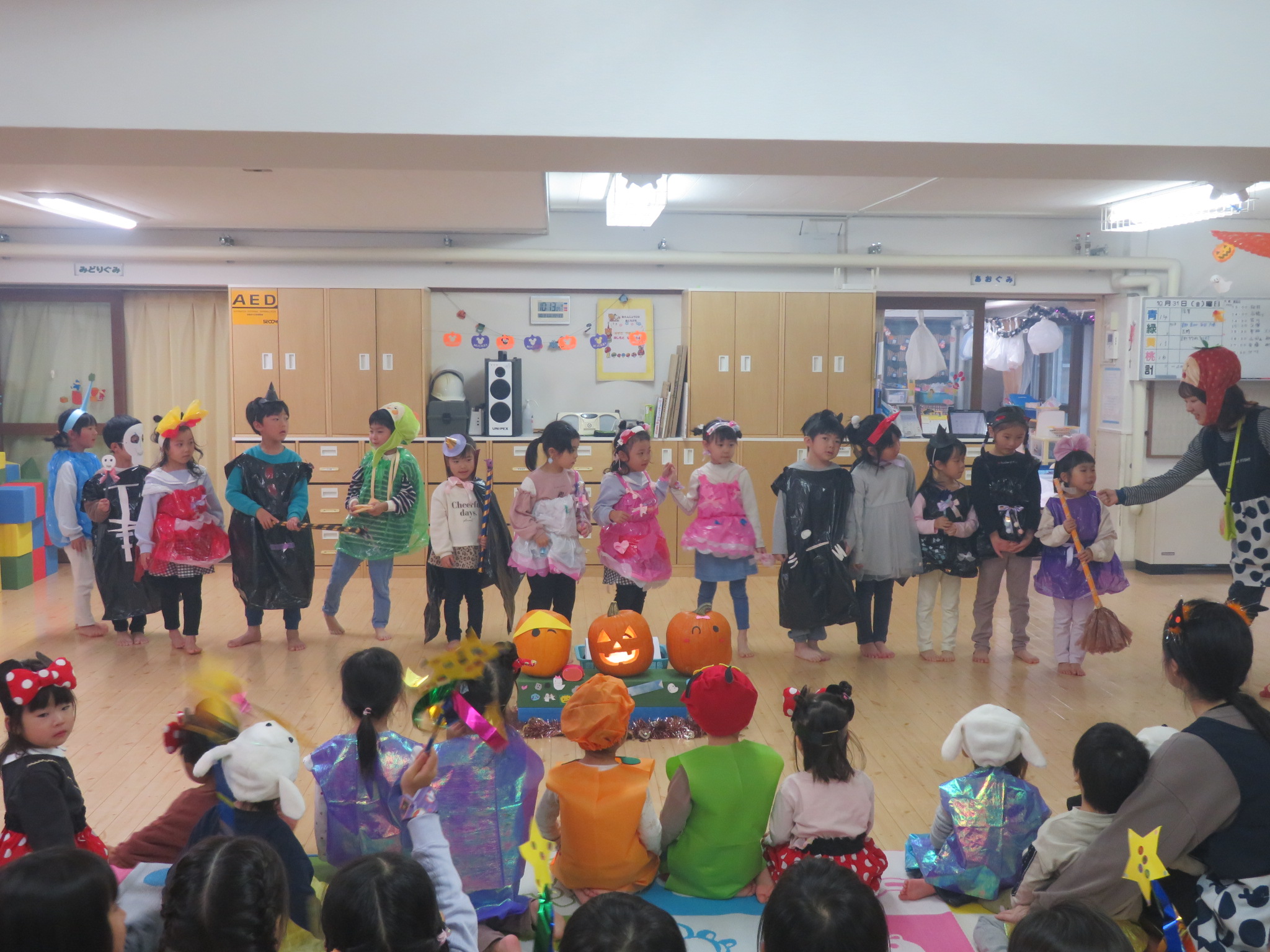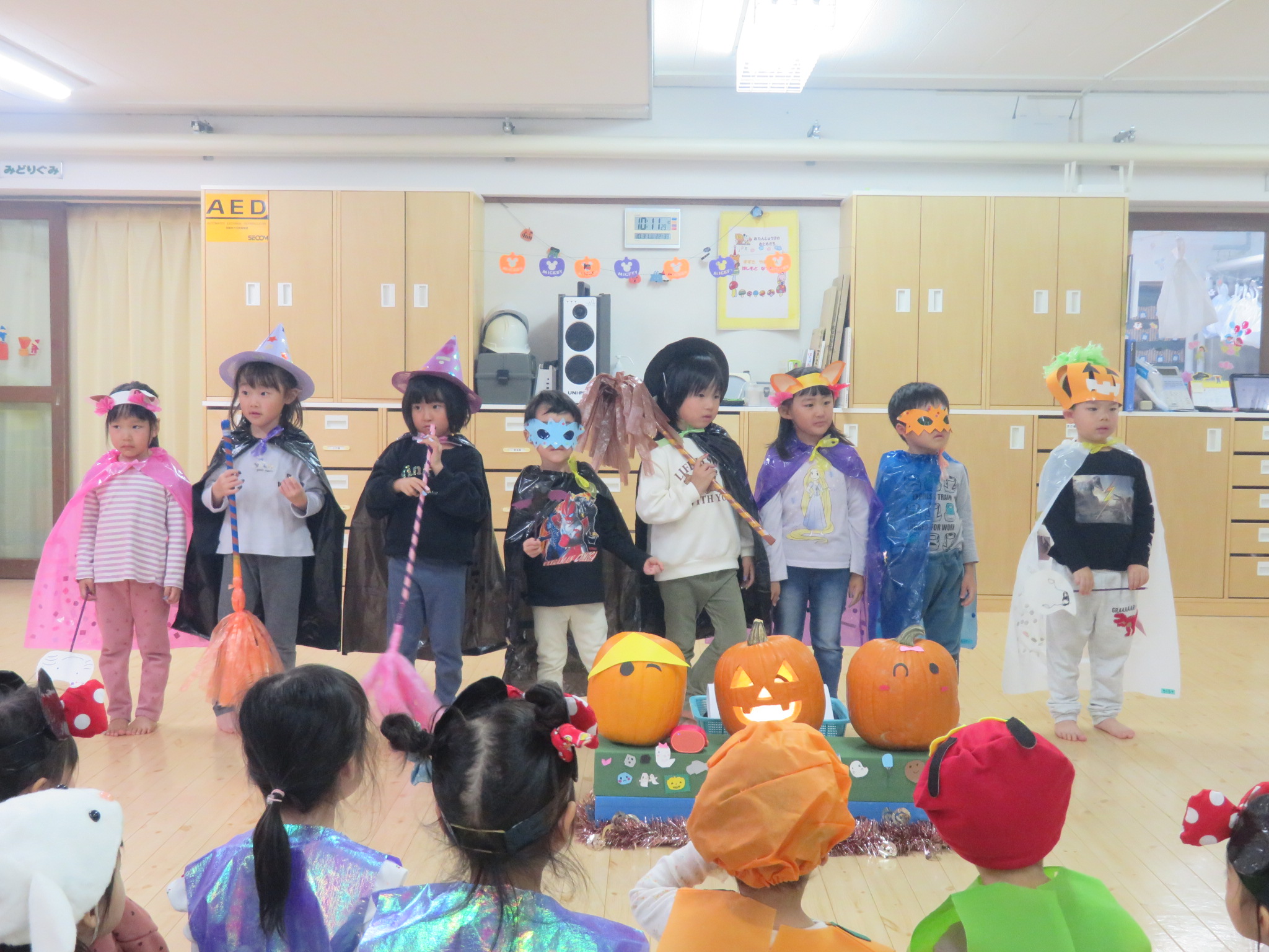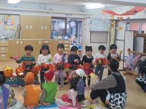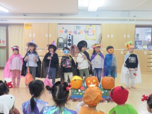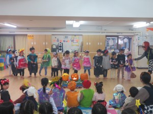 子ども達はハロウィンに向けて、衣装を製作してきました。それを身に着けてホールでハロウィンパーティーをしました!