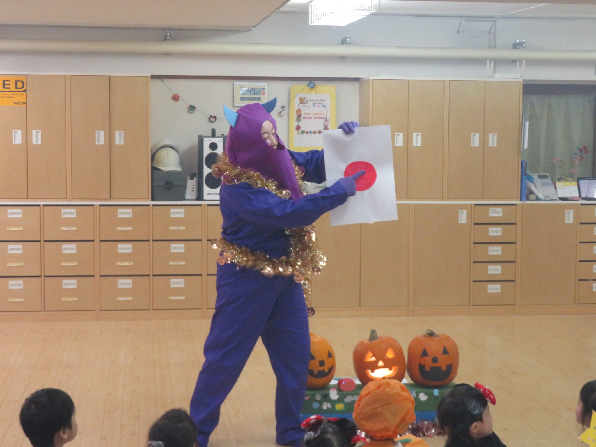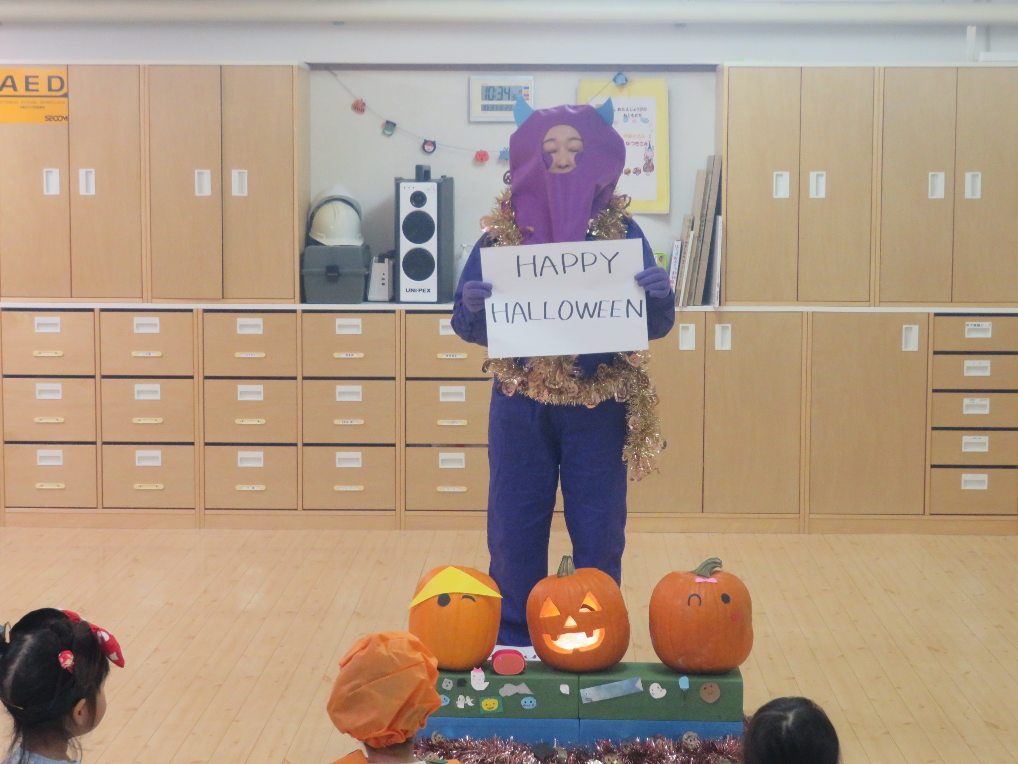 衣装の発表が終わると、今月のお誕生会で登場した「ラリー」が今日も来てくれて、ハロウィンについて教えてくれたり、ハロウィンにまつわる言葉の英会話を教えてくれました。
