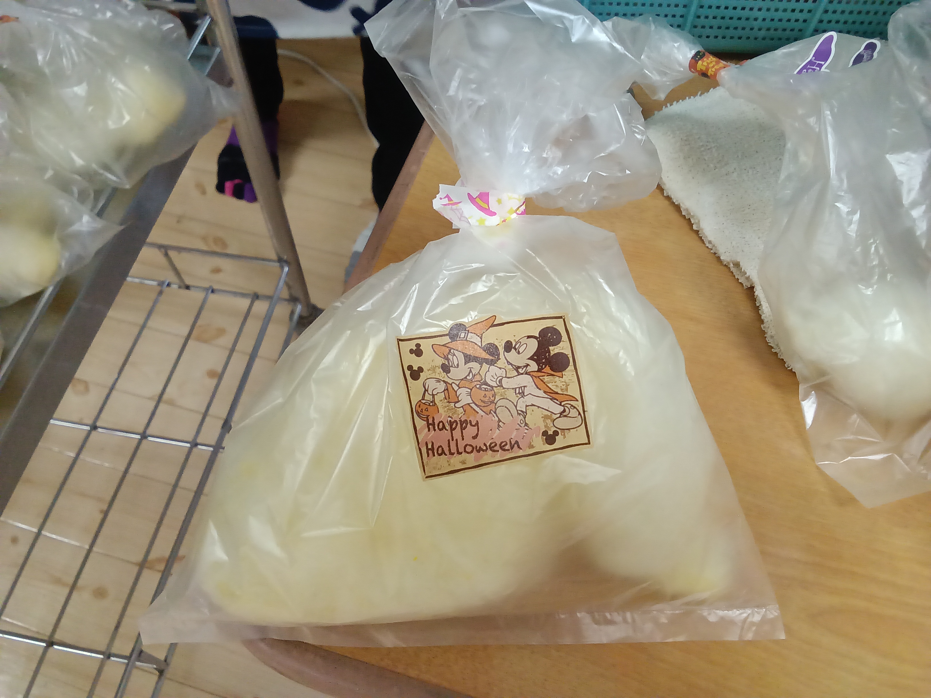 黄組さんは、黄組のお部屋にあったミッキーマウスのハロウィン飾りとお揃いのミッキーマウスを製作し、服を作っていました。服は着方によって、カボチャパンツにも、腹巻にもなるそうです!