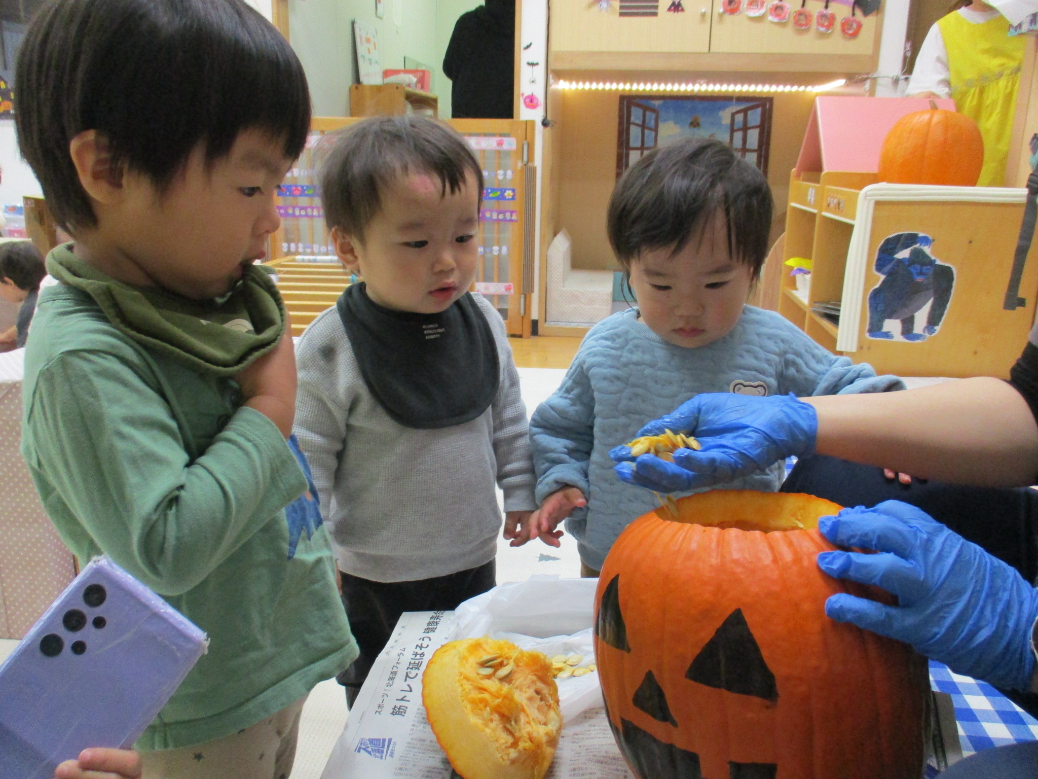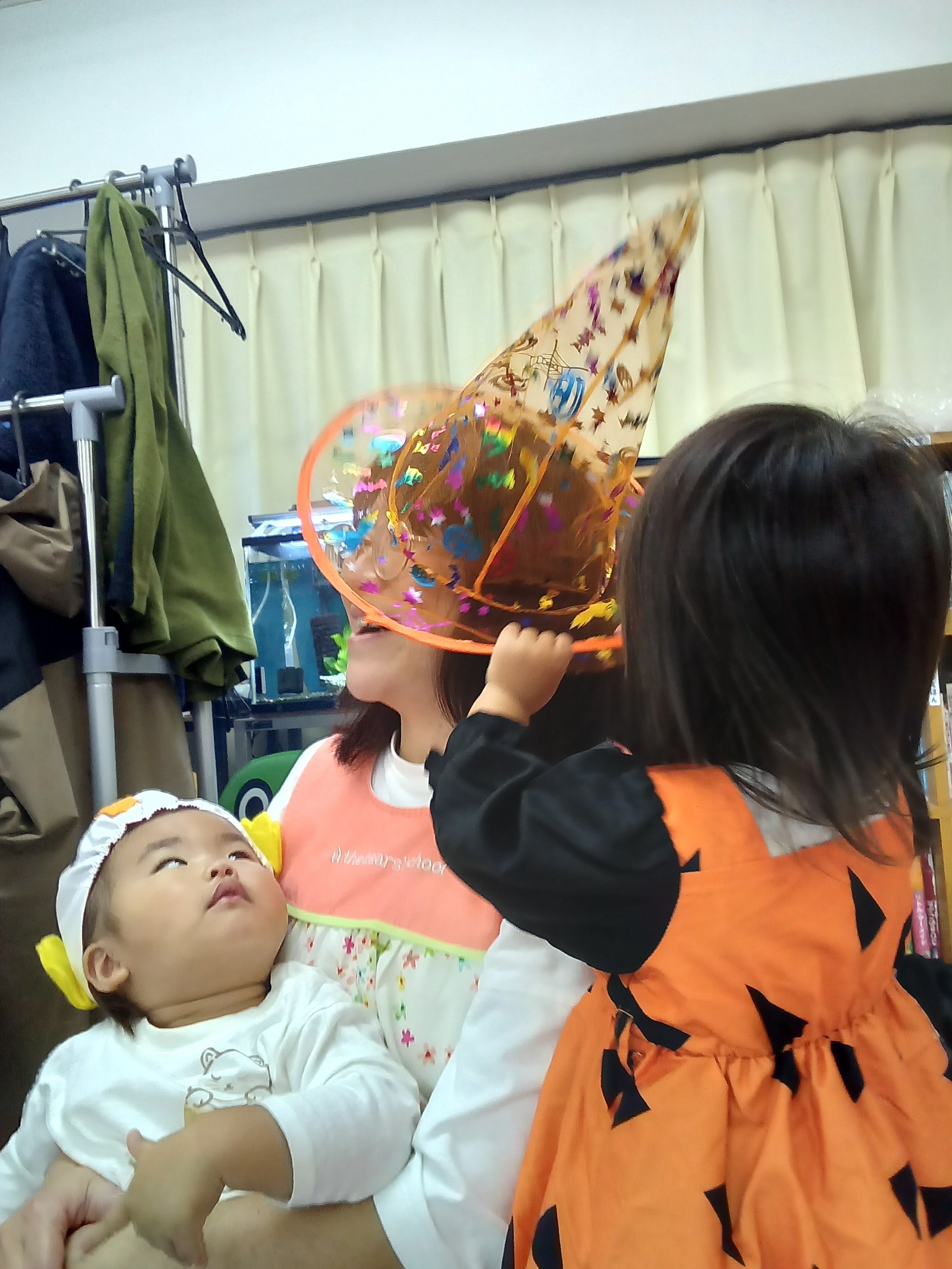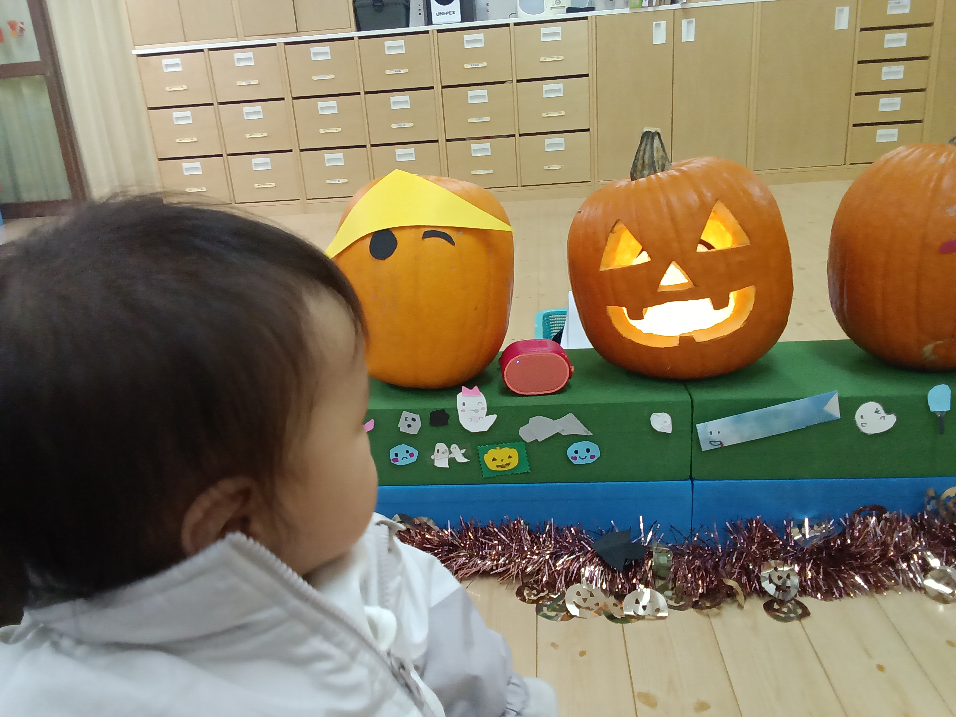 いつもとは違うハロウィン仕様の本園にドキドキしながらも、大きいお友だちの仮装に興味津々!!