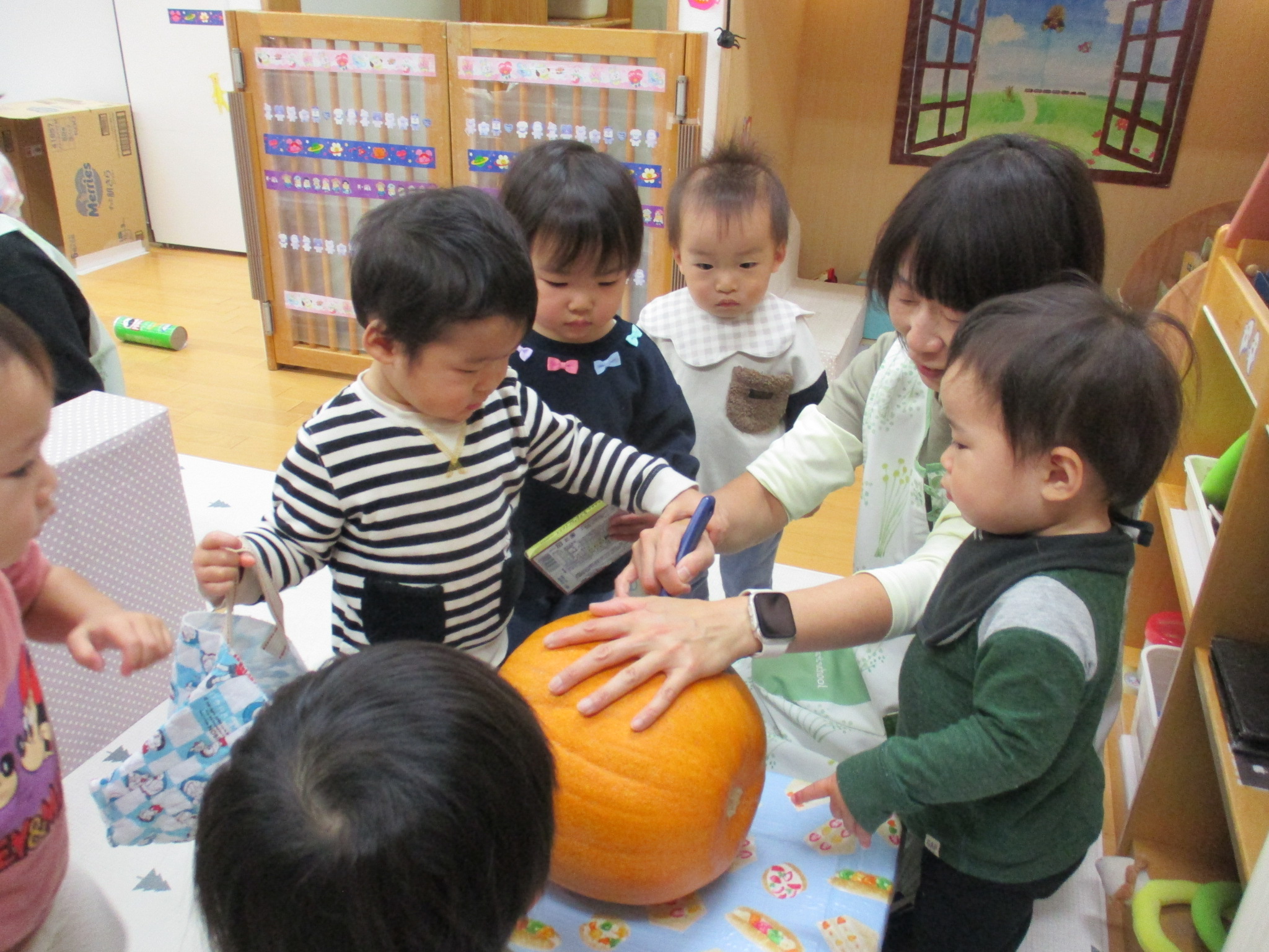 ハロウィン前日から大きなカボチャやオバケの人形を見てワクワクドキドキしていた子ども達!
