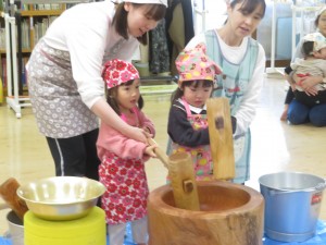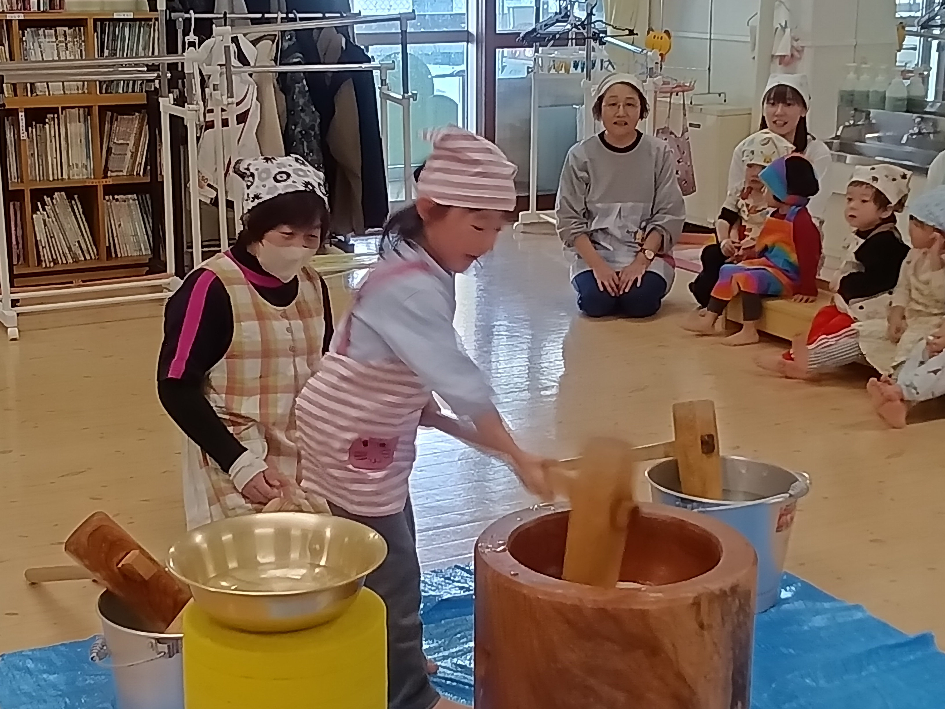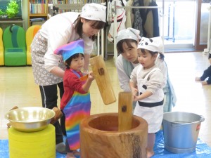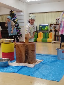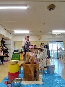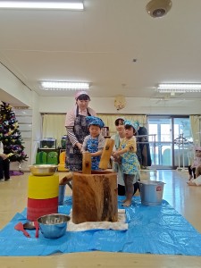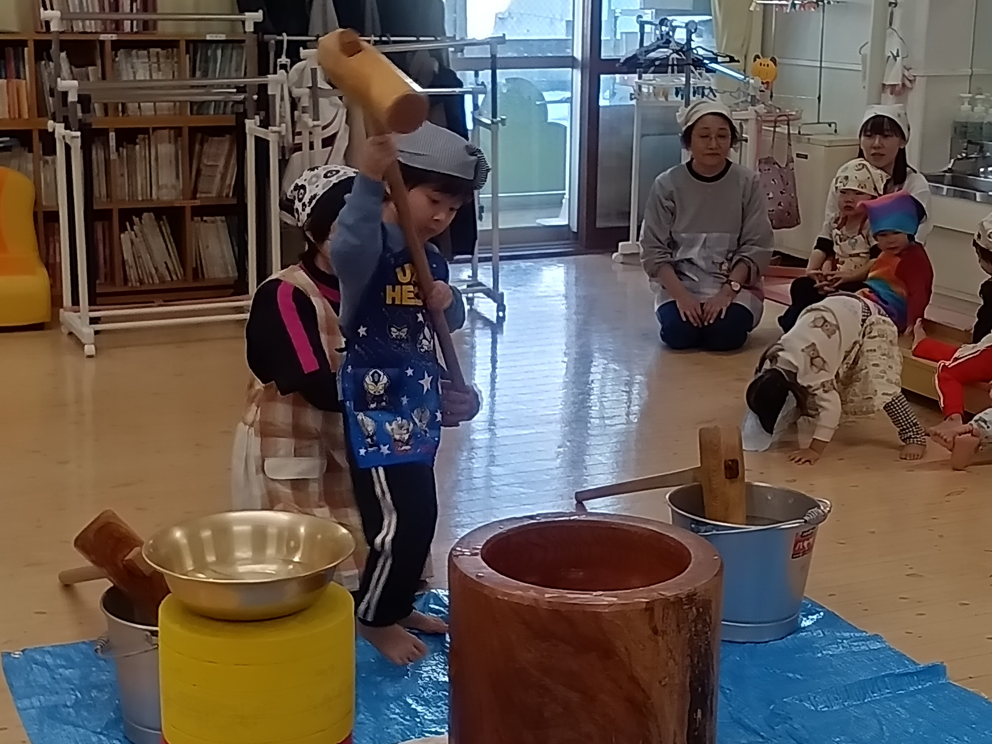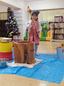 保育士と一緒に重たい杵を持って「よいしょ!」と、一生懸命ついていました。