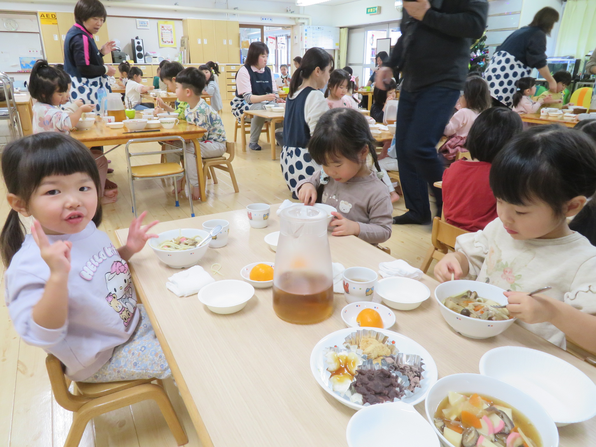 お昼ご飯は、出来立てのお餅が入ったお雑煮と、給食さんが作ってくれた、みたらし餅、あんこ餅、きなこ餅、チョコ餅など、色々な味のお餅を、自分で選んで食べました。