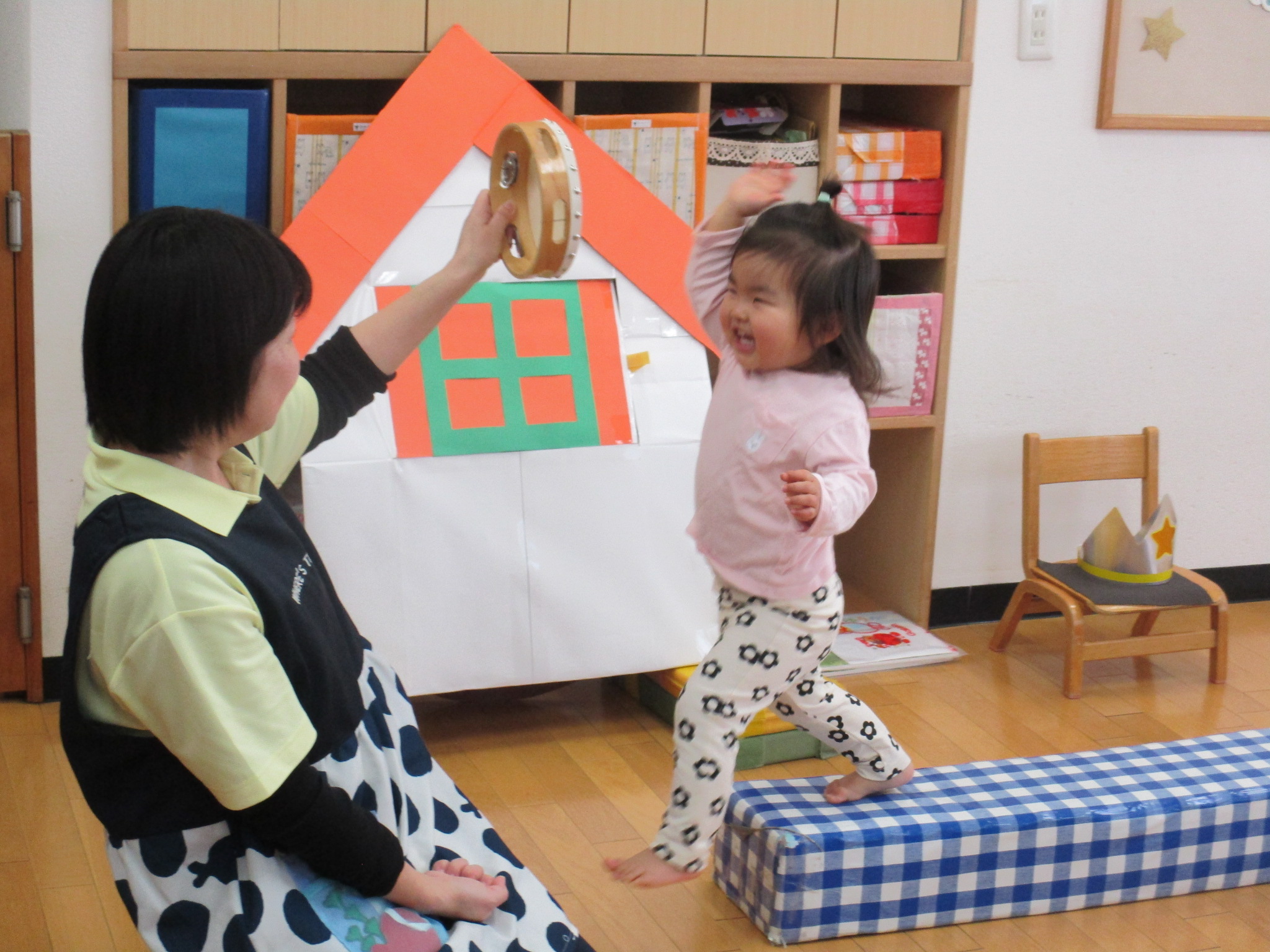 平均台の上を歩いてタンバリンを叩いて見せてくれましたよ。その後はアンパンマンの歌を披露してくれました♪