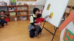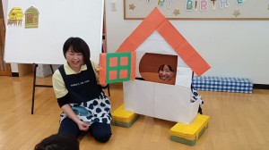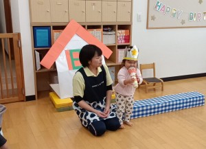 保育士の出し物は『きれいなお窓』と言うパネルシアターでした。色んなお家から動物の鳴き声が聞こえて来ると「アヒルさん?」「ブーブーぶたさん!!」と出てくる動物を予想して教えてくれながら楽しそうに見ていました。最後の大きいお家からは発表会の時に一緒に踊ったマロンちゃんが出てきて、皆で一緒にダンスを踊りましたよ!