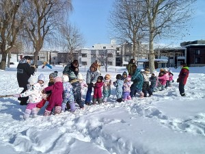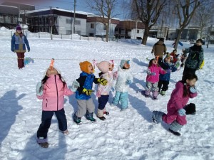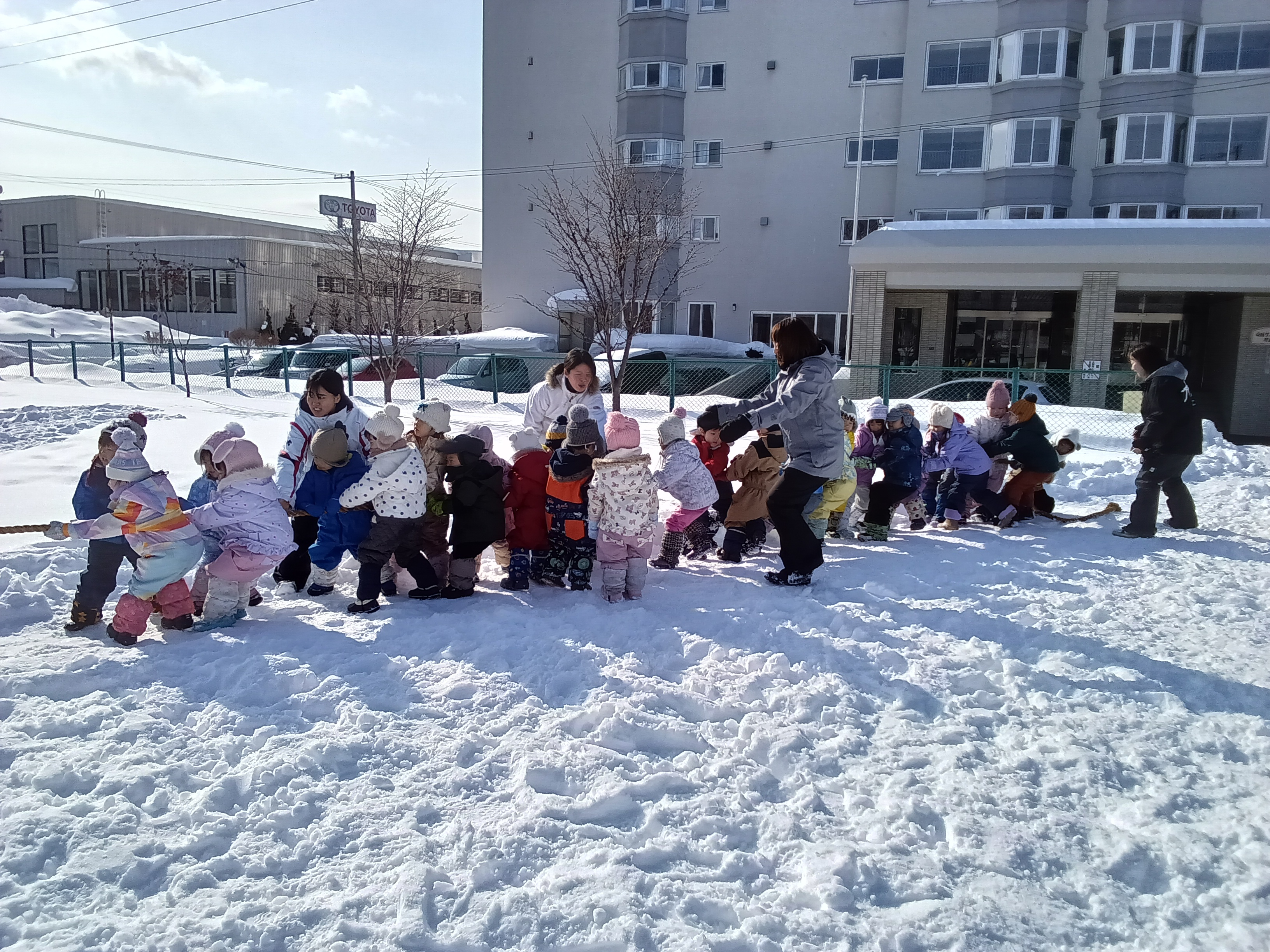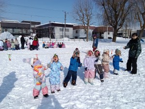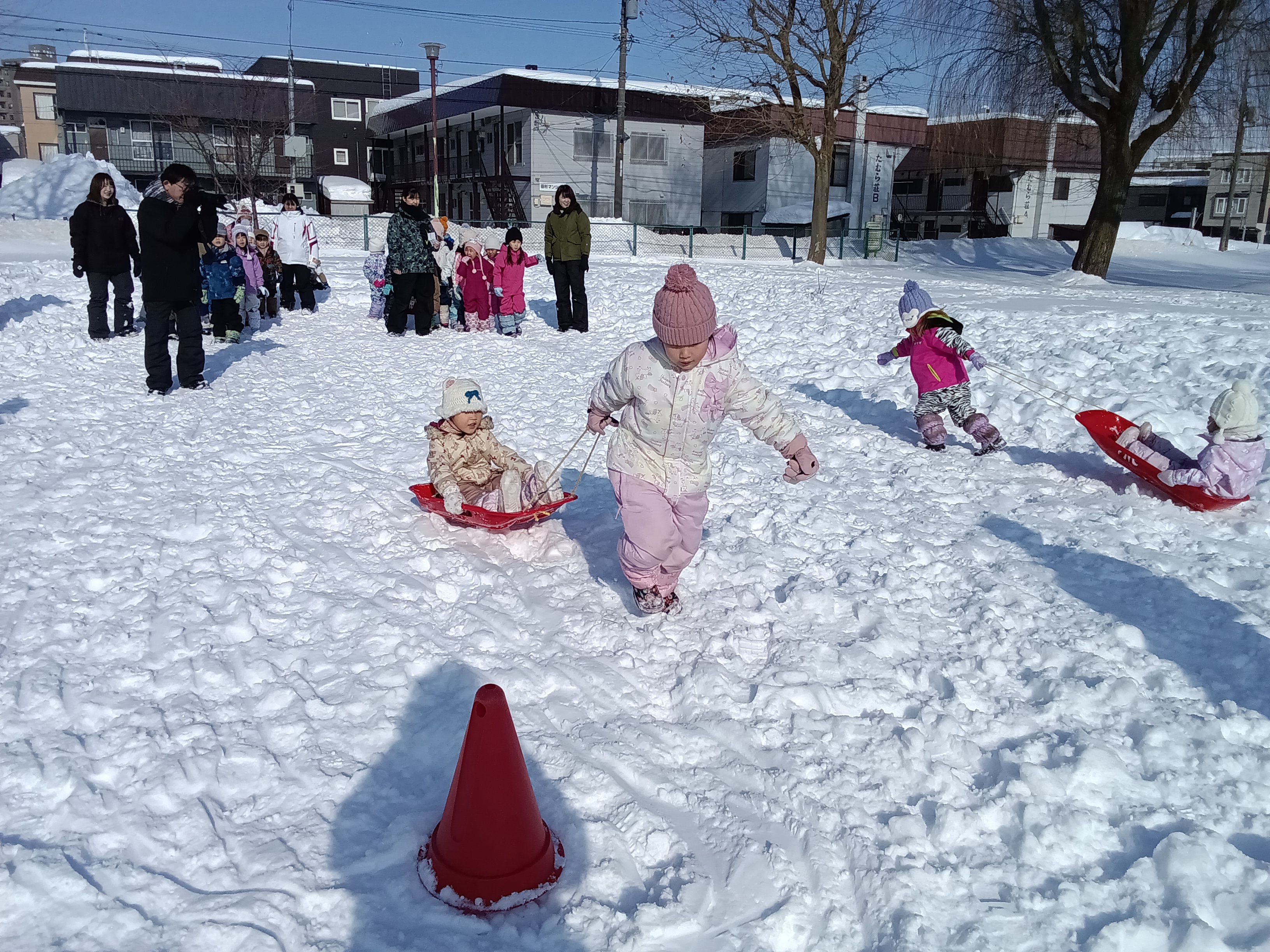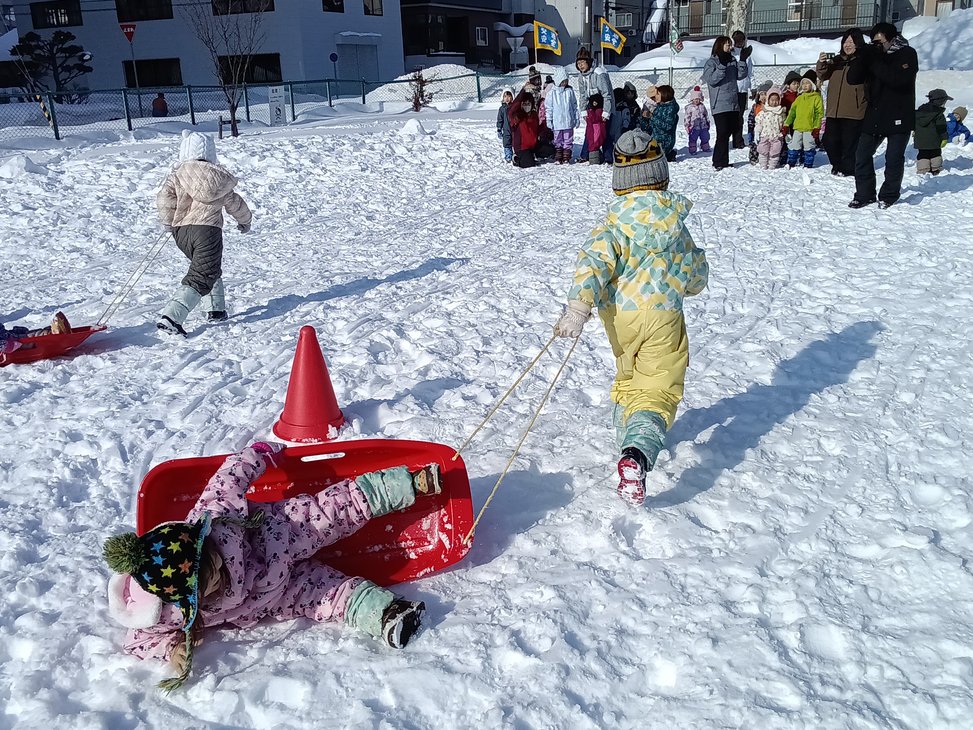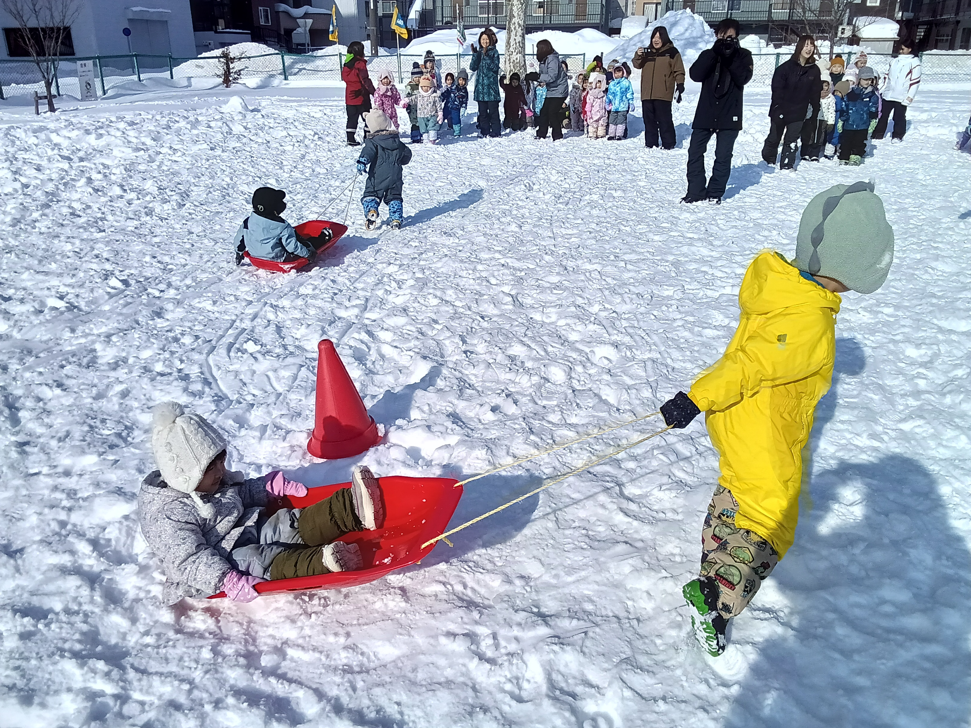 青組が黄組を、緑組が桃組をそりに乗せて引っ張りました。そりに乗る子は落ちないようにしっかりとつかまり、引っ張る子は力いっぱい引っ張って走っていました。途中、そりから落ちてしまうハプニングもありましたが、ゴール目指して最後まで頑張りました。