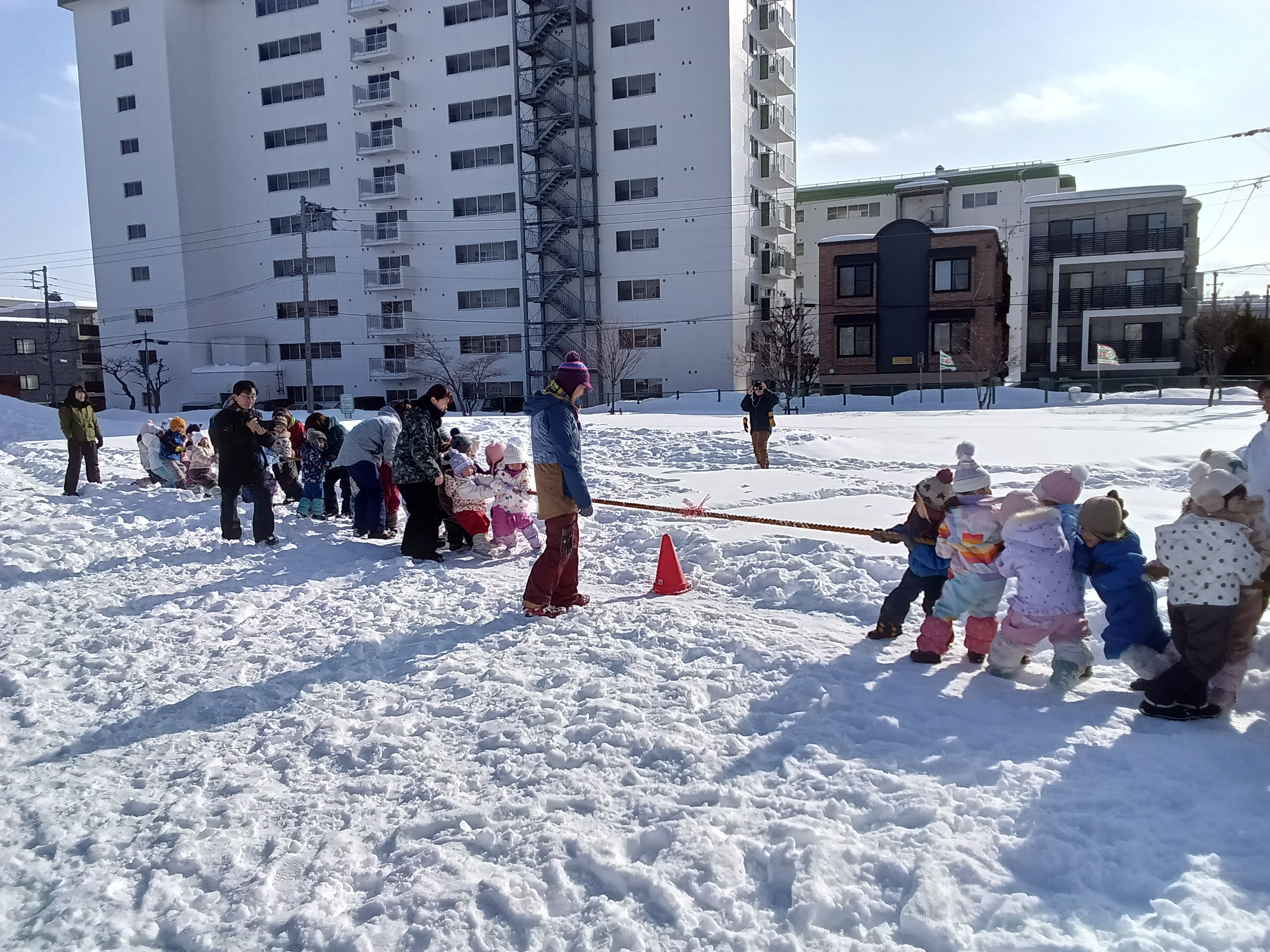 雪の上なのでバランスを取って引っ張るのはとても難しいのですが、最後まで力いっぱい引っ張り、1対1の引き分けでした!
