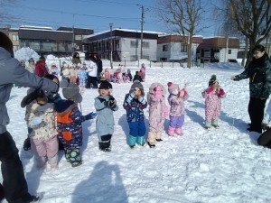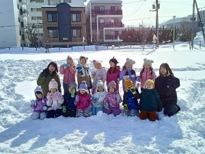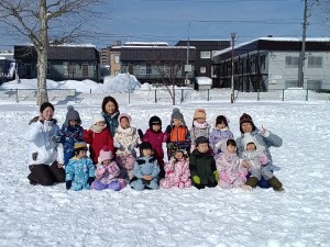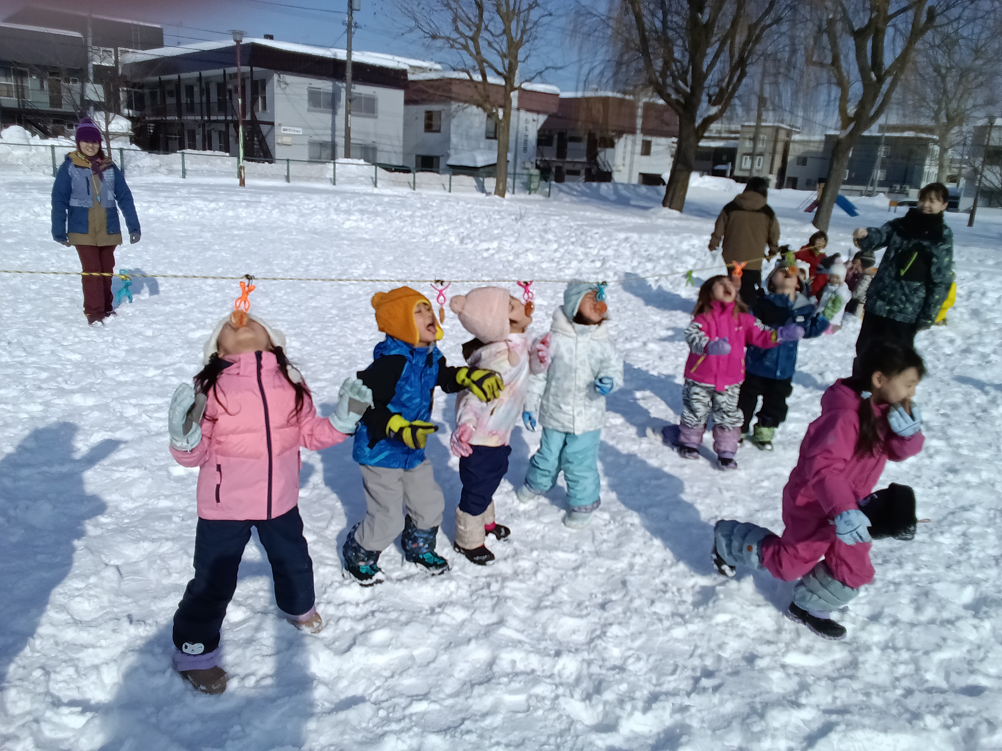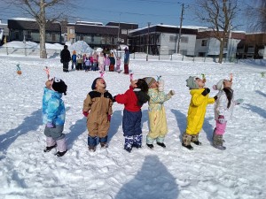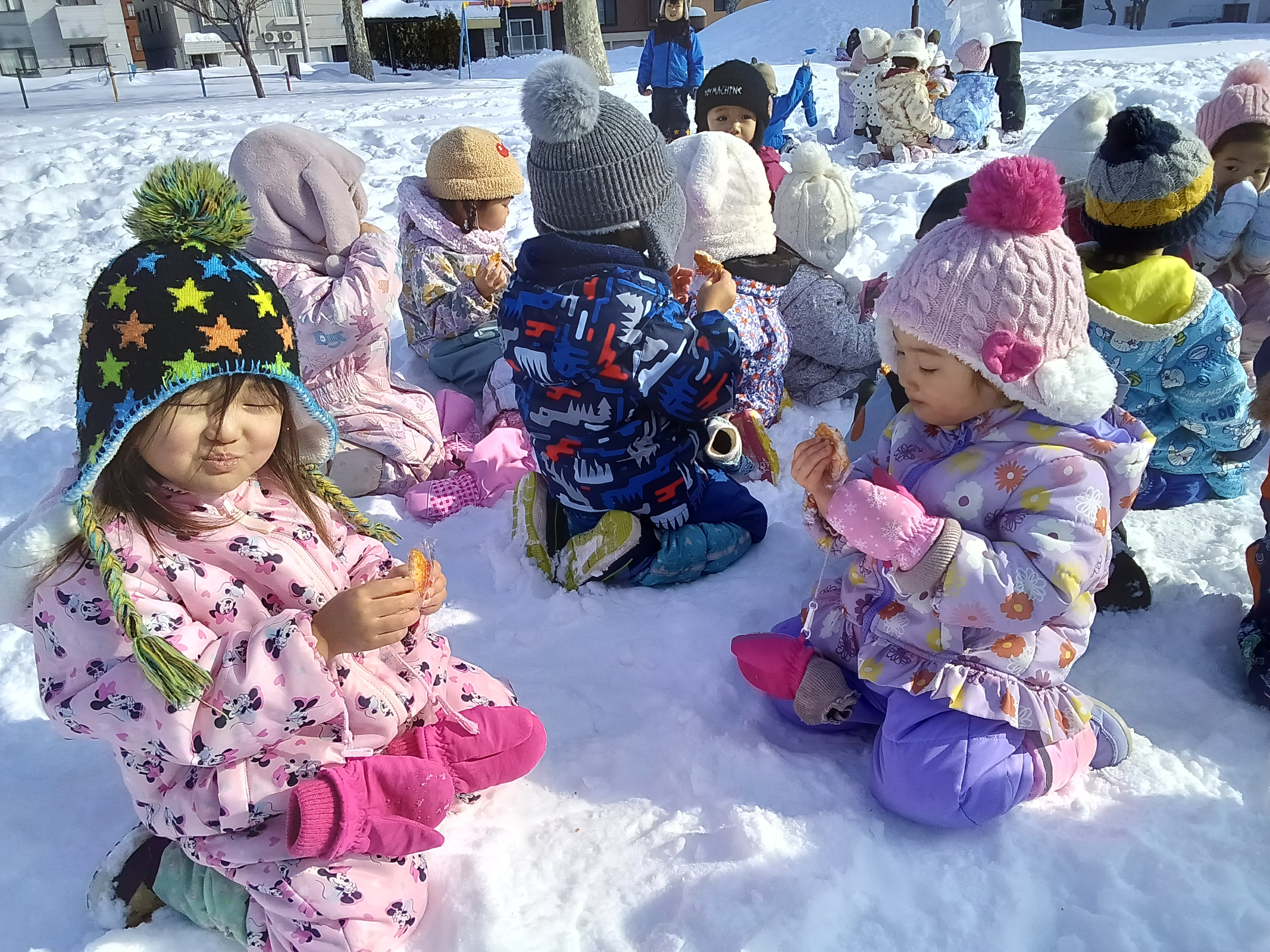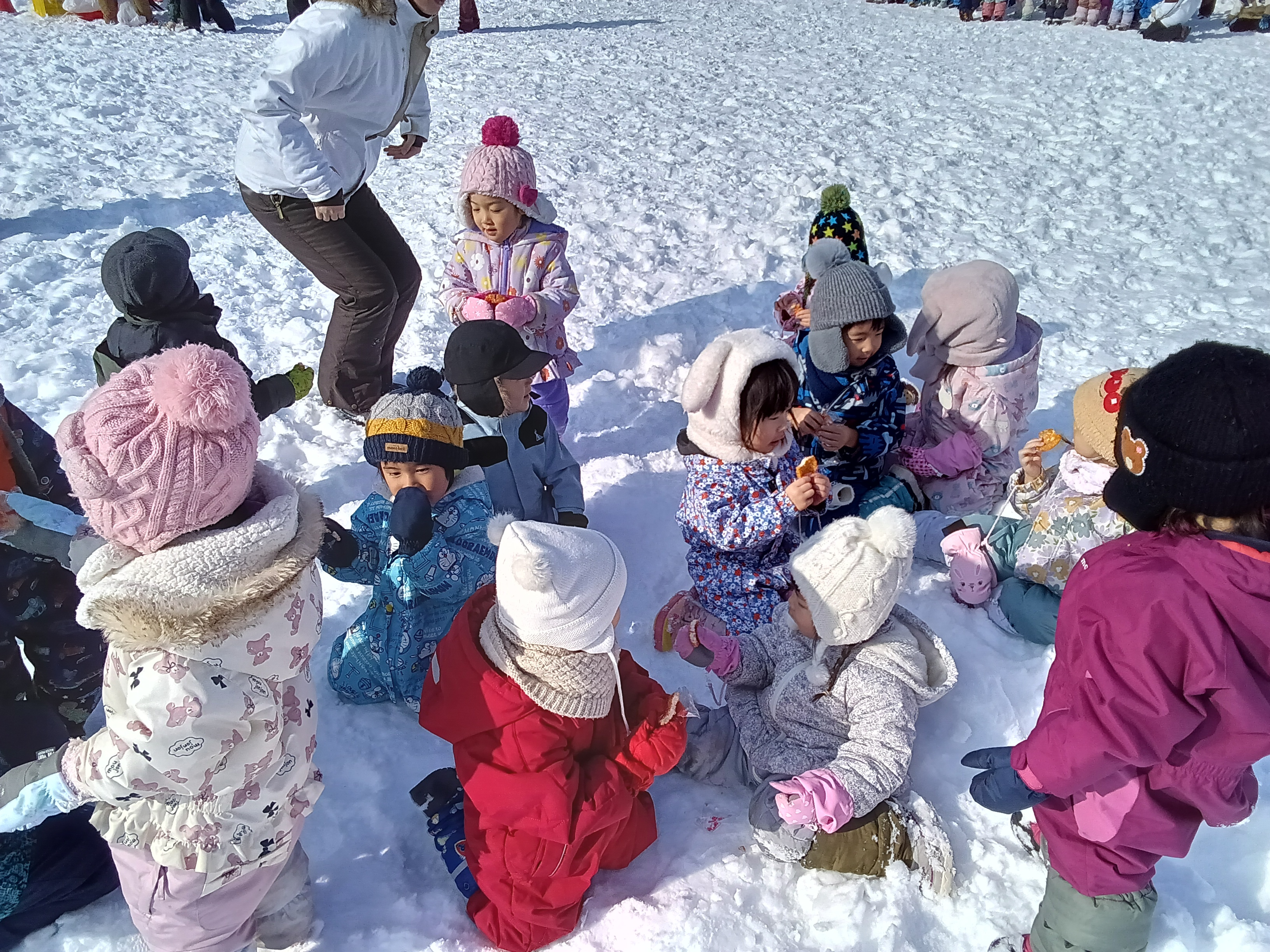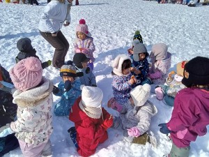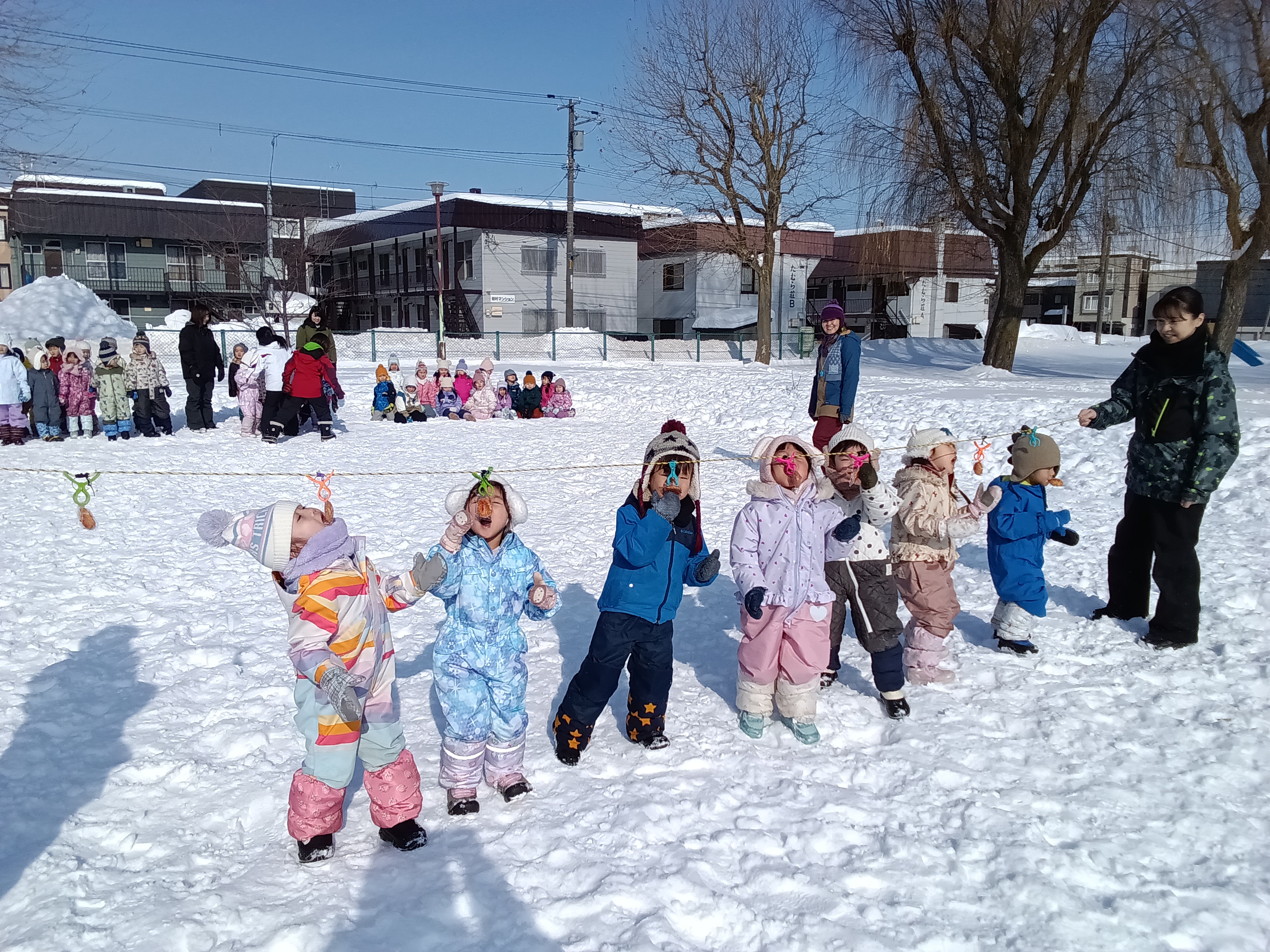 最後は、せんべい食い競争をしました。手を使わずに、ぶら下がっているせんべいを口で取ってゴールします。みんな口を大きく開いて上手に口にくわえてゴールすることができました。取ったせんべいはみんなで雪の上で食べました☆ 頑張って取ったせんべいは特別美味しかったようですよ!