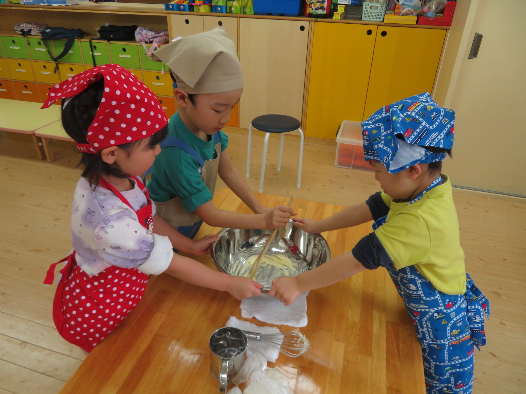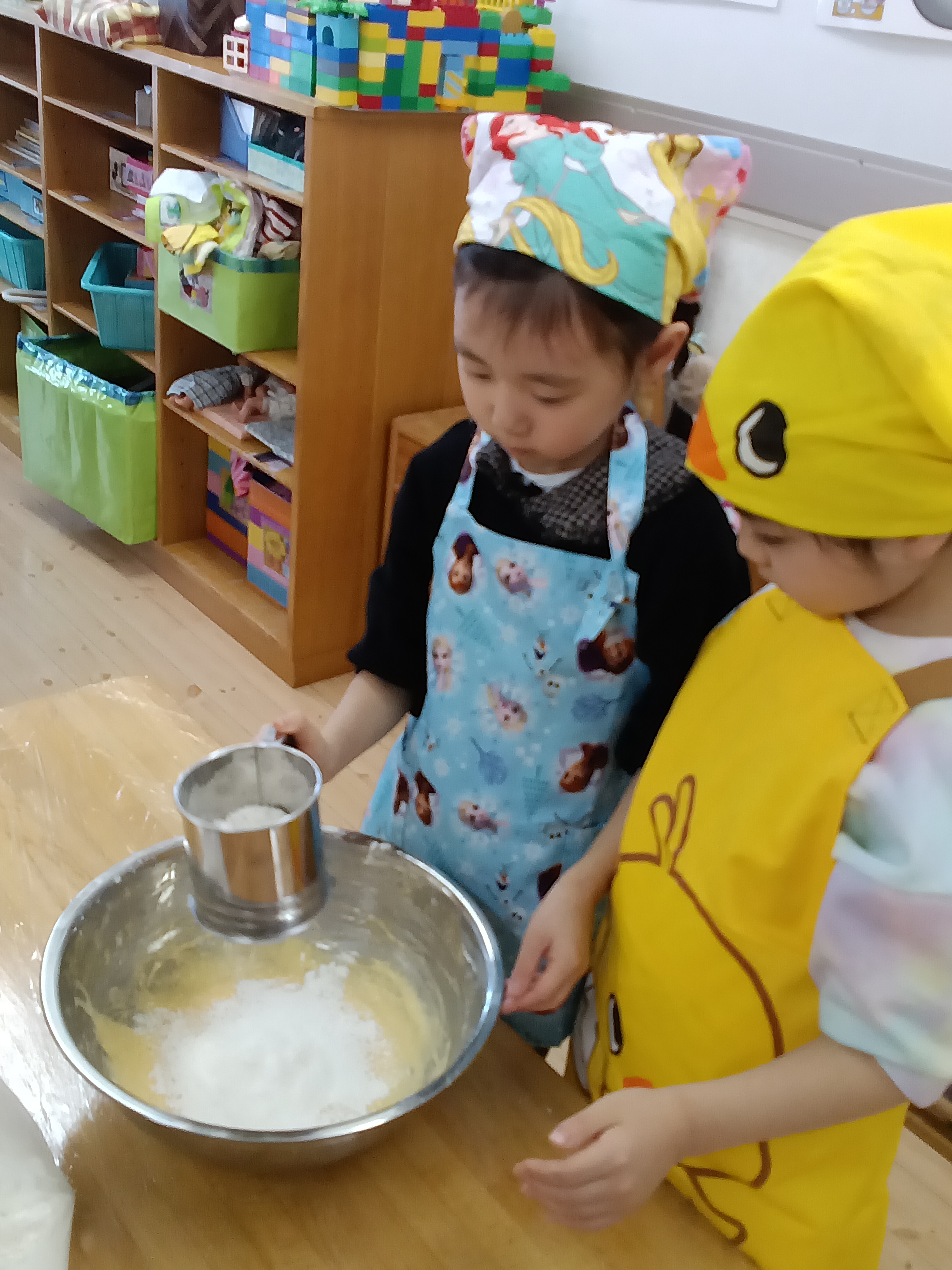 卵を割るのも、粉ふるいも、さすがあお組さん。とても上手でした!