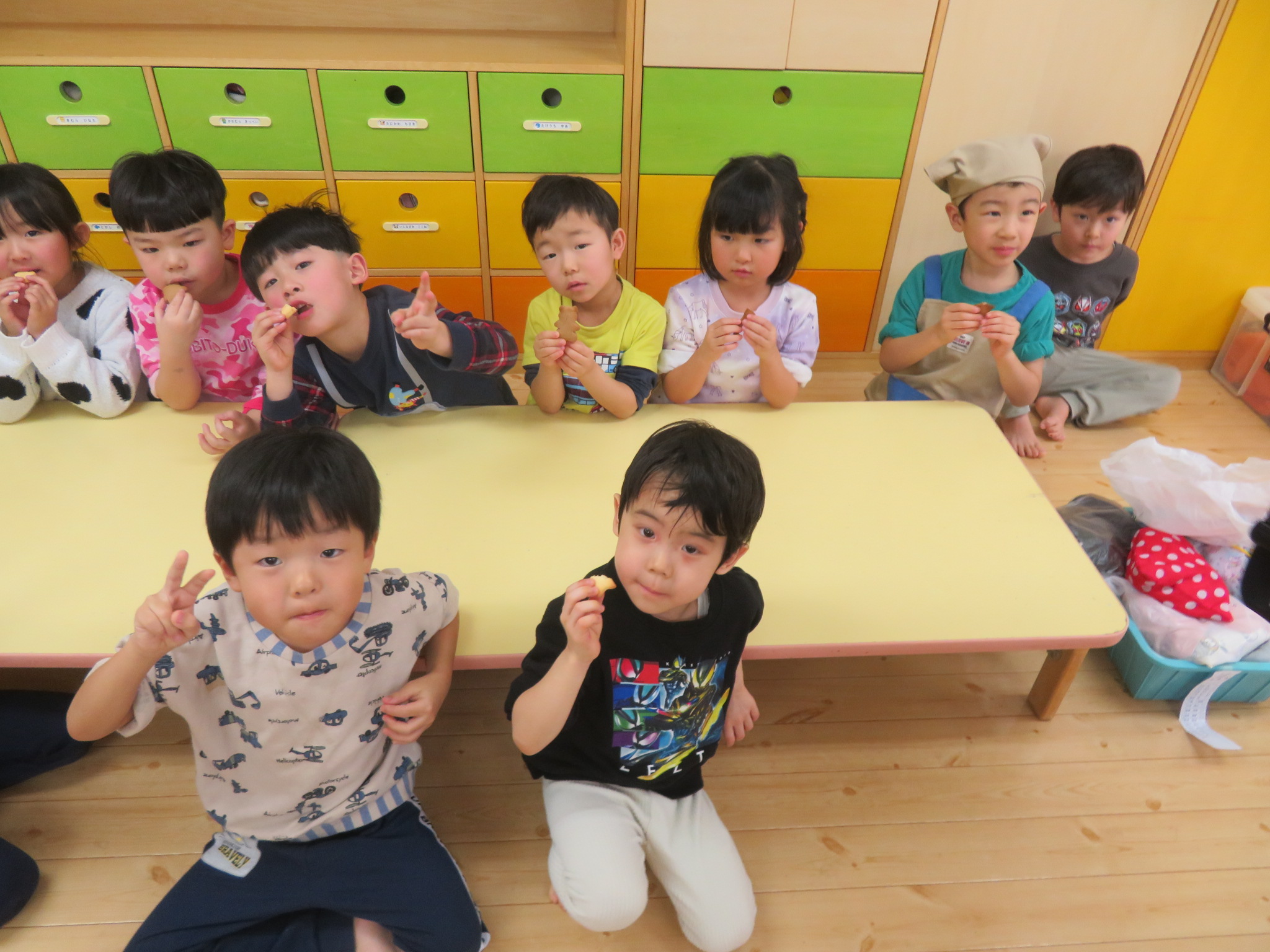また、みんなで焼いたクッキーは午後のおやつとして、もも組さん、きいろ組さんも食べました。みんな「美味しい!」「かわいい!」と、おかわりもしてたくさん食べていました