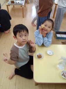 出来上がったクッキーを食べ、「甘くておいしい♬」と嬉しそうに食べていました。