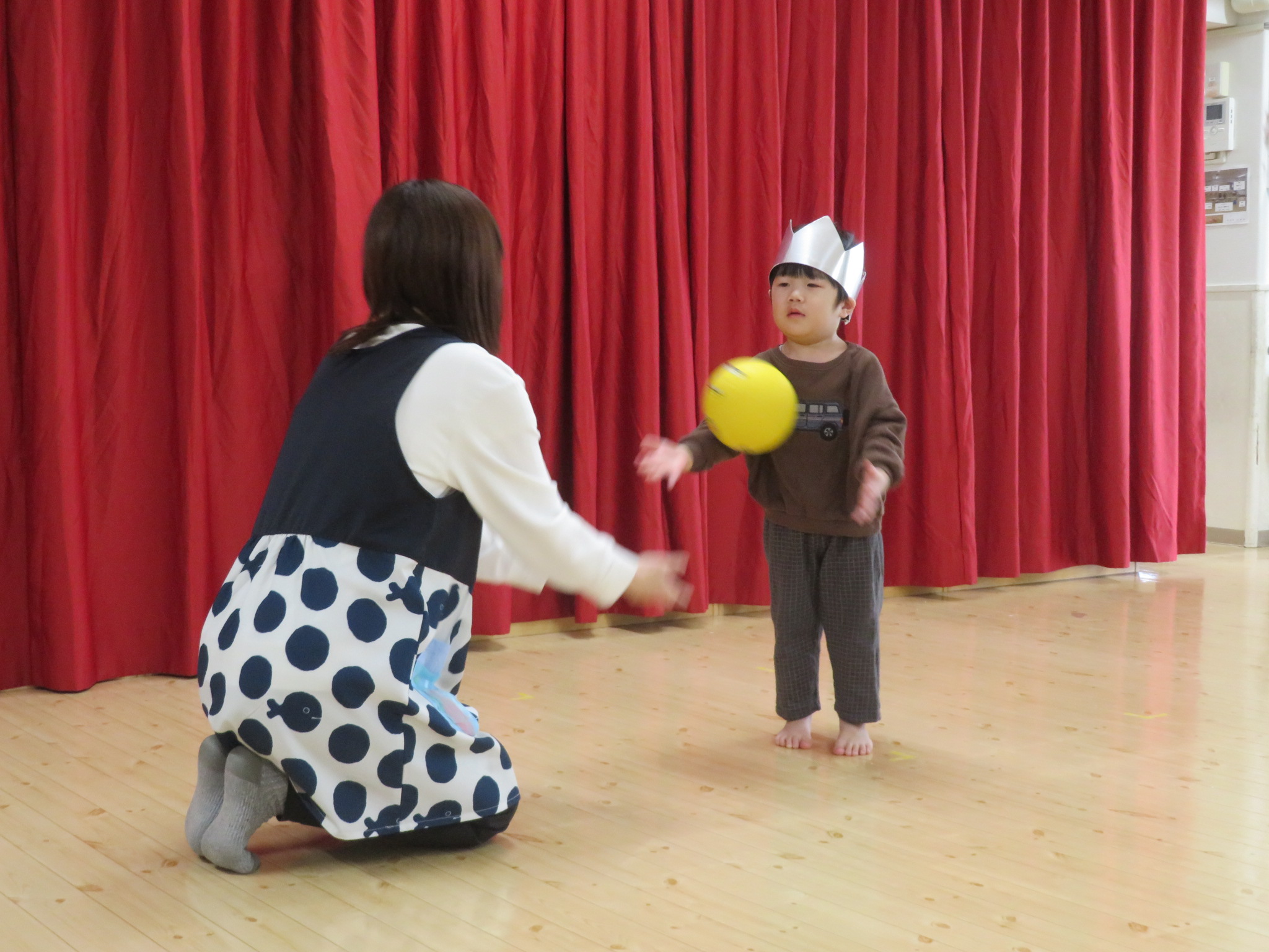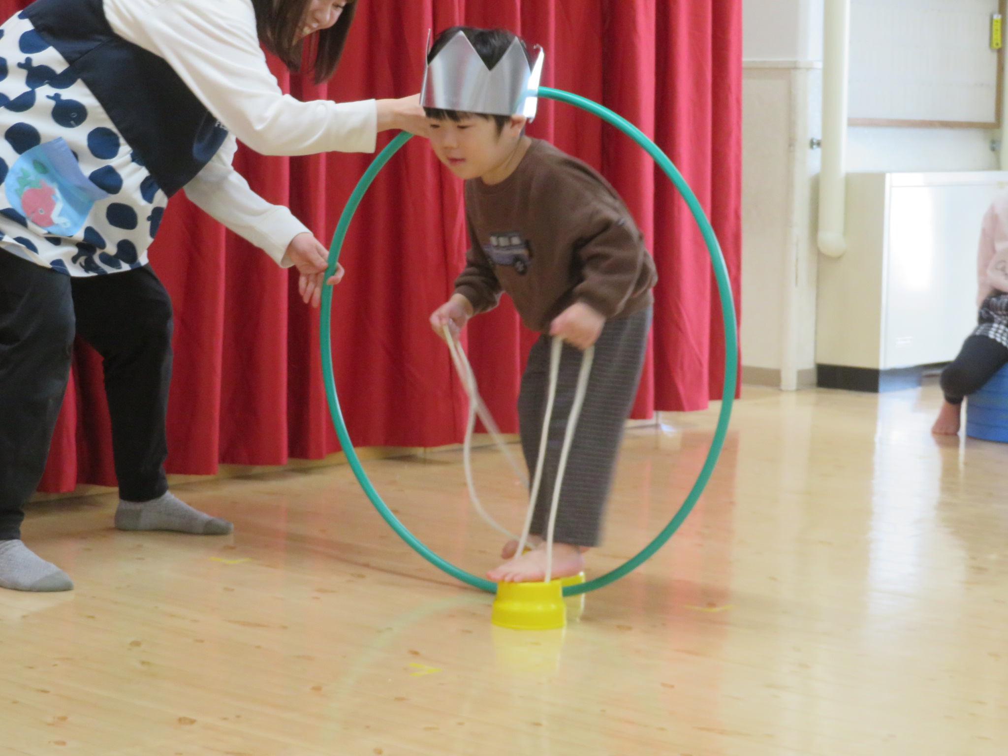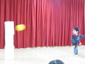 桃組のお友だちは、みんなの前で少しドキドキしながらも、保育士とキャッチボールをしたり、缶ぽっくりを披露してくれました。缶ぽっくりではフラフープをくぐり抜けるという技を披露してくれましたよ!