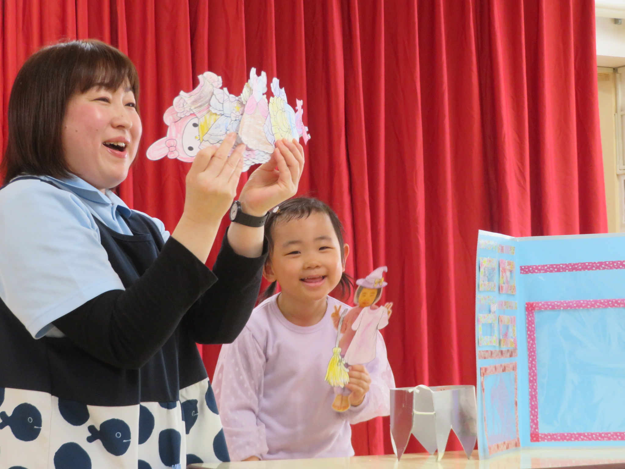 黄組のお友だちは、この1年でぬり絵がとても上手になったので、ぬり絵で着せ替えを作って見せてくれました。たくさんの服や帽子、アクセサリーなどを作っていて、とても可愛く着せ替えして見せてくれました。