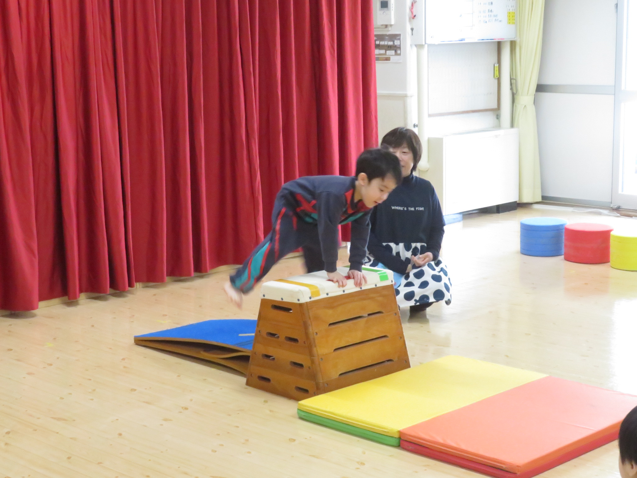 緑組のお友だちは、跳び箱と大好きなヒーロー「仮面ライダーゼッツ」に変身してかっこいいポーズや、大きく描いた悪者の怪獣をボールを使って退治してくれました。跳び箱は助走なくてもとてもきれいに跳んでいました。仮面ライダーの真似も高い所から飛び降りたりととてもかっこよかったです。