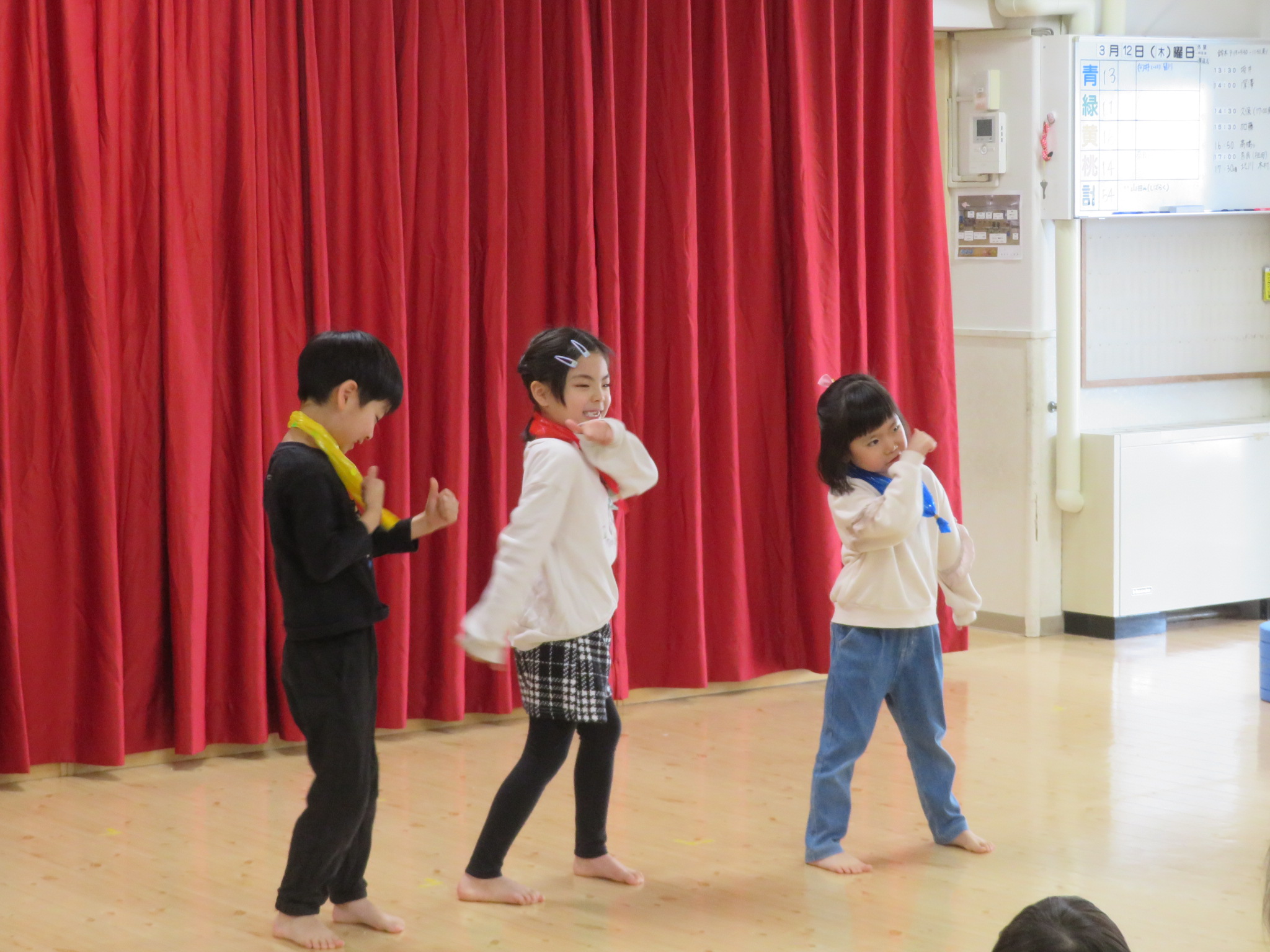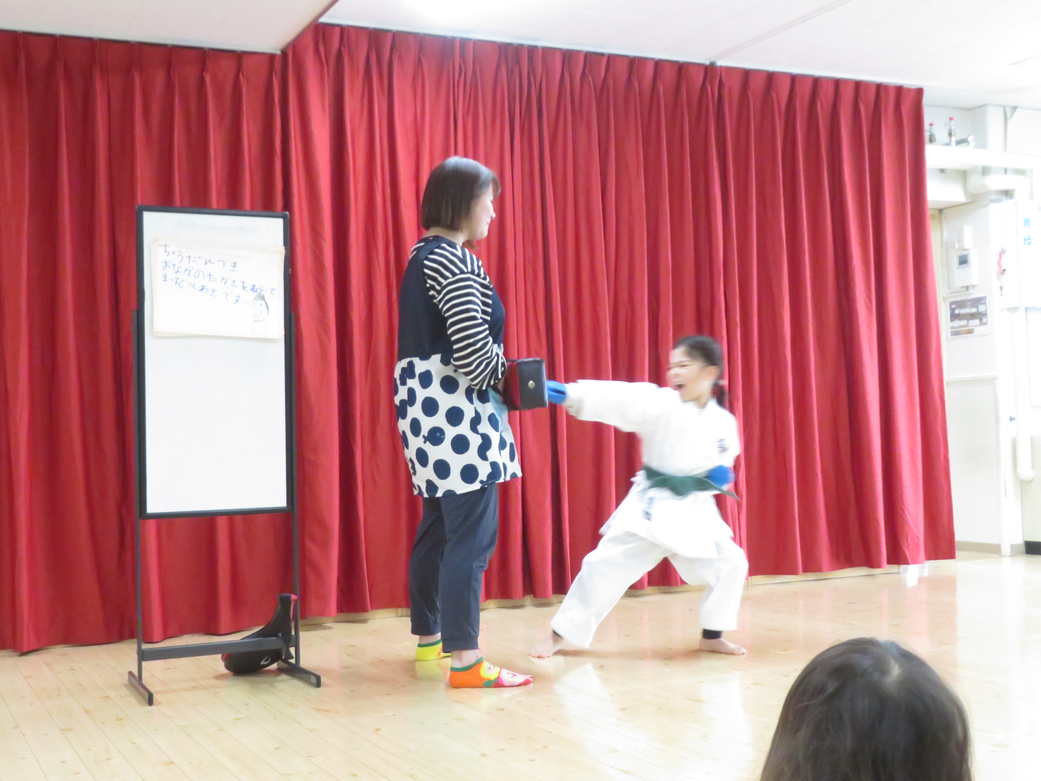 青組のお友だちは、習っている空手と、大きくなったらなりたいアイドルを披露してくれました。空手では、技の紹介をしてから披露してくれました。技と大きな掛け声がとてもかっこよかったです。またお友だちと一緒にアイドルグループ「ミルク」の曲を歌って踊ってくれました。